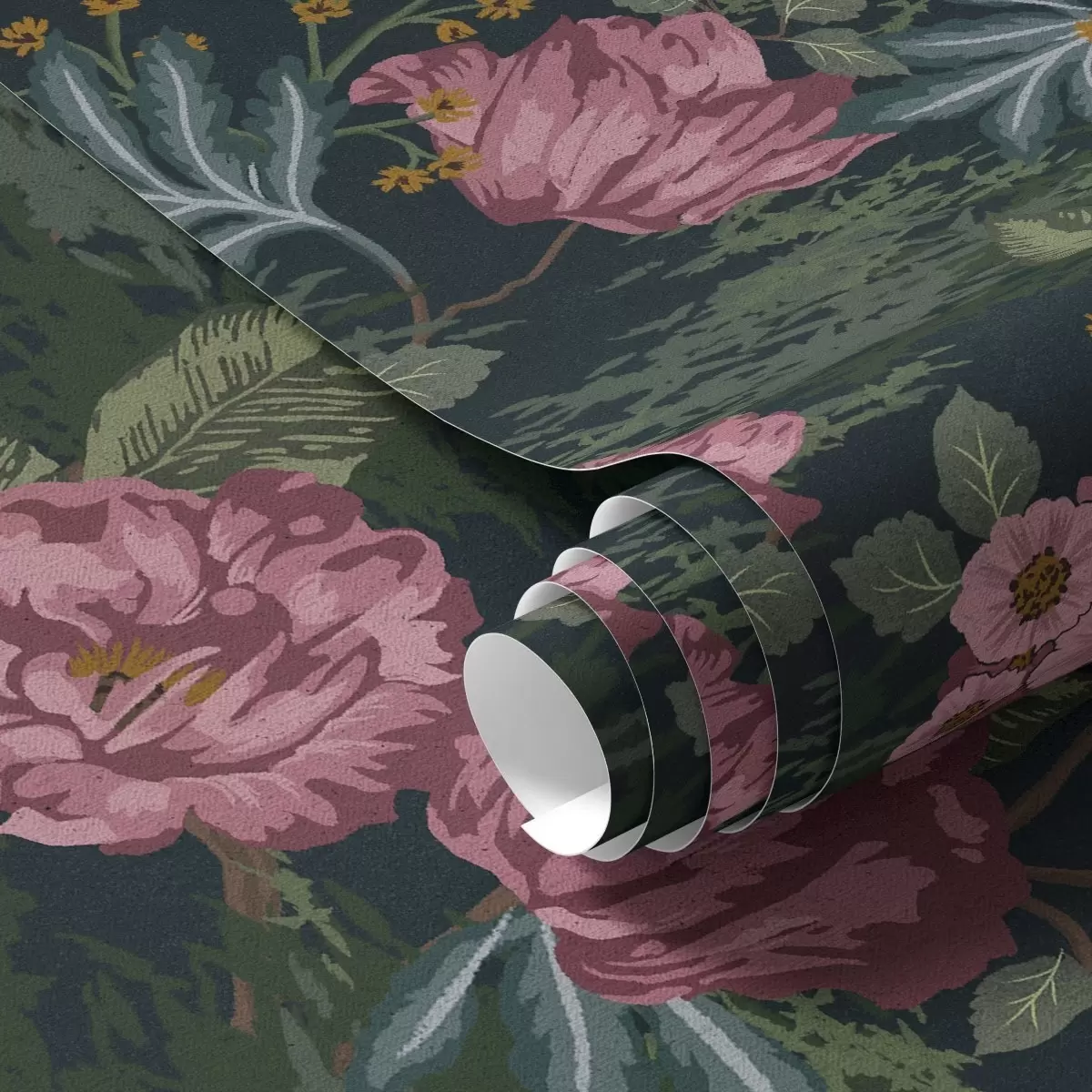 Papiers peints Flore sombre avec des fleurs et des feuilles roses, fond sombre Nr. a00724