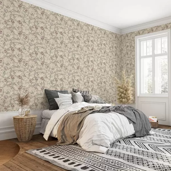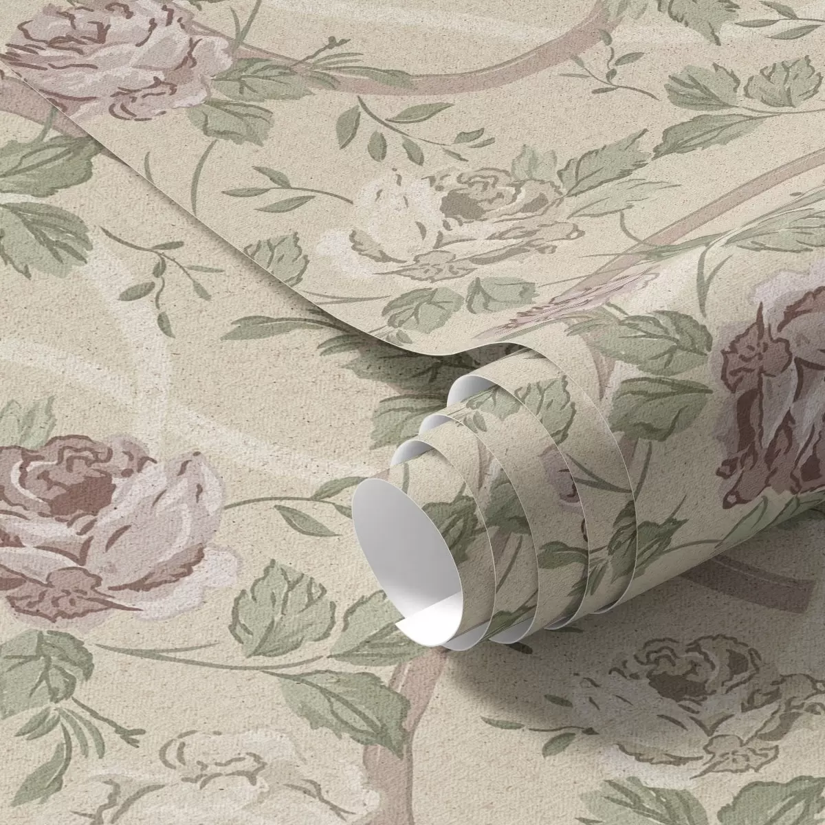 Papiers peints Roses avec des feuilles vertes sur un fond beige chaud Nr. a00729