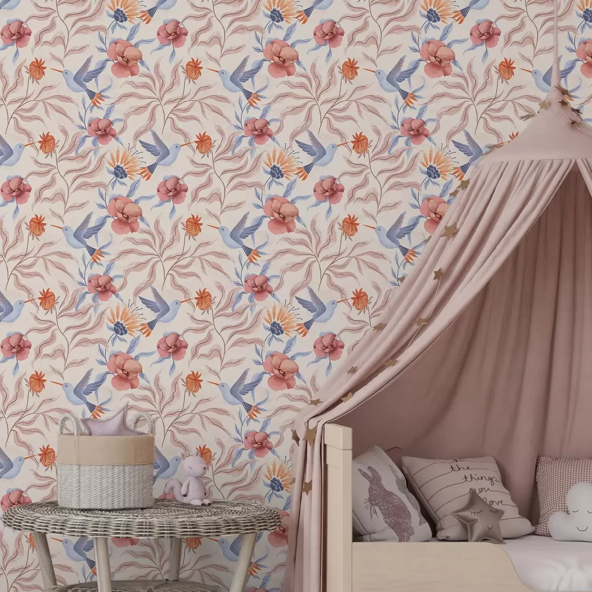 Papiers peints Colibris parmi de grandes fleurs aux tons roses et bleus Nr. a00733