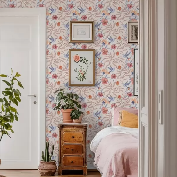 Papiers peints Colibris parmi de grandes fleurs aux tons roses et bleus Nr. a00733