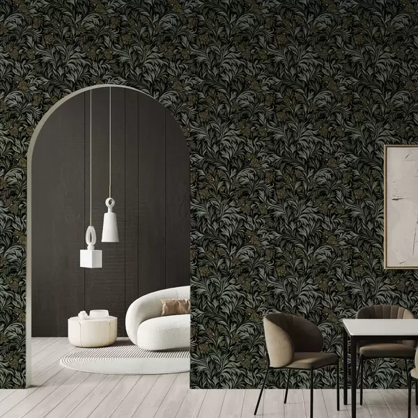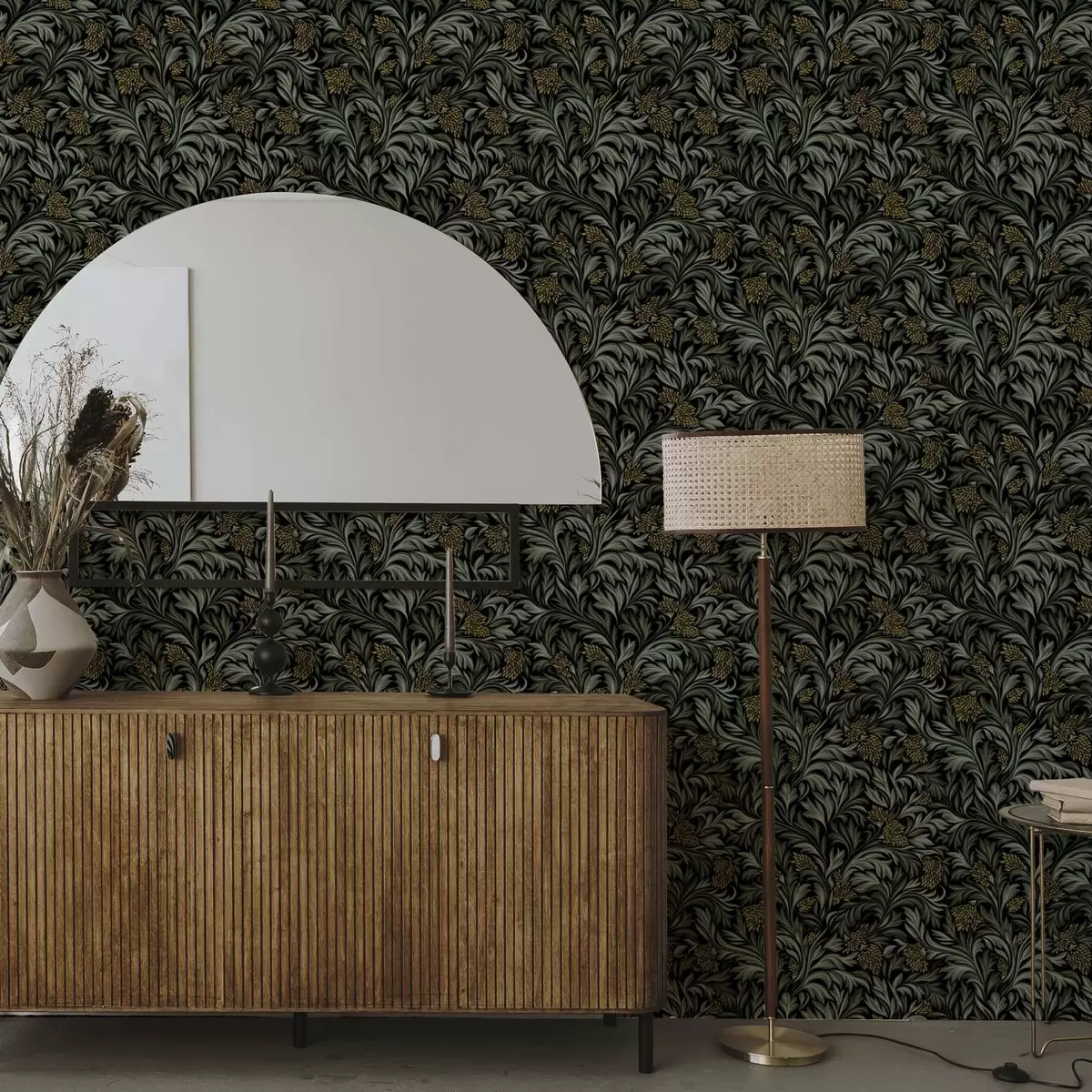 Papiers peints Feuilles d'acanthe foncées avec des cônes dorés sur fond noir Nr. a00745