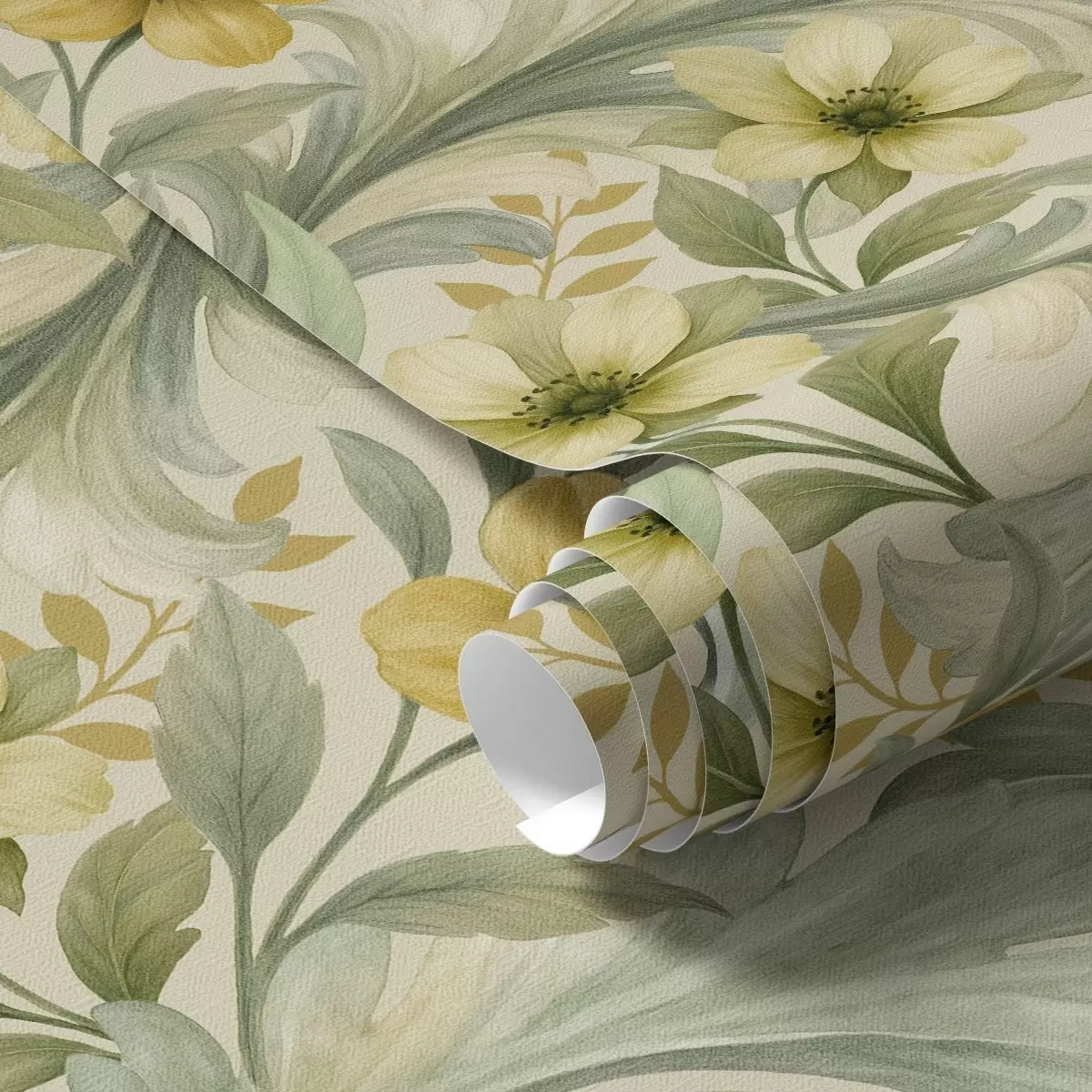 Papiers peints Volutes d'acanthe avec fleurs dans les tons verts et jaunes Nr. a00749