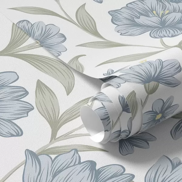Papiers peints Fleurs bleu poussiéreux avec feuilles d'olivier sur fond blanc Nr. a00780