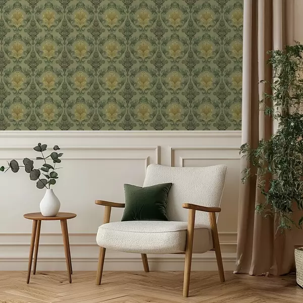 Papiers peints Damassé à volutes végétales, palette ocre olive Nr. a00828