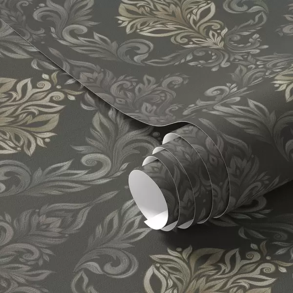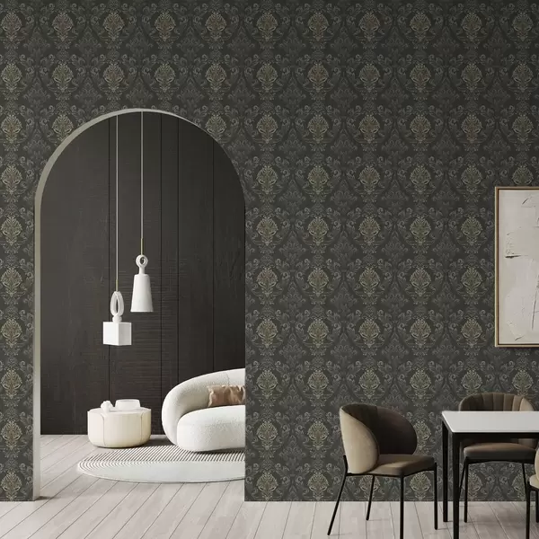 Papiers peints Damas sur fond graphite foncé, accents olive-ocre Nr. a00828v5