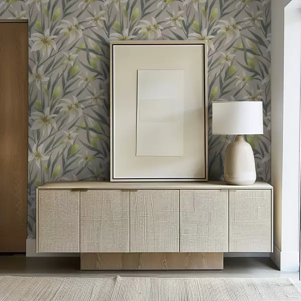Papiers peints Lys crème avec feuilles sur fond gris-beige Nr. a00837