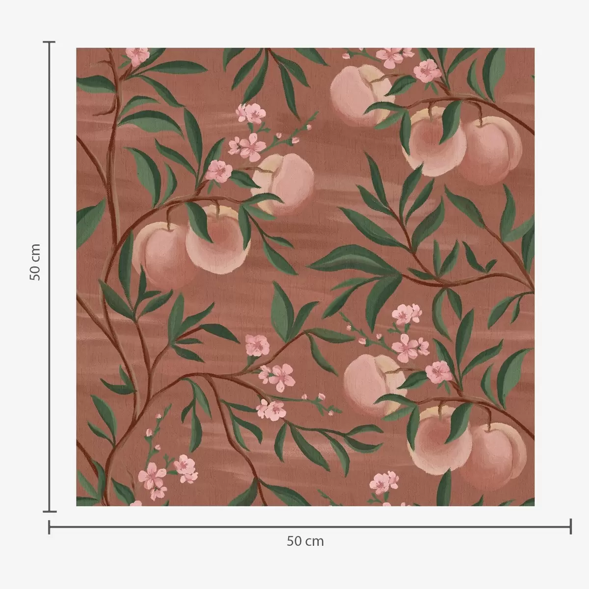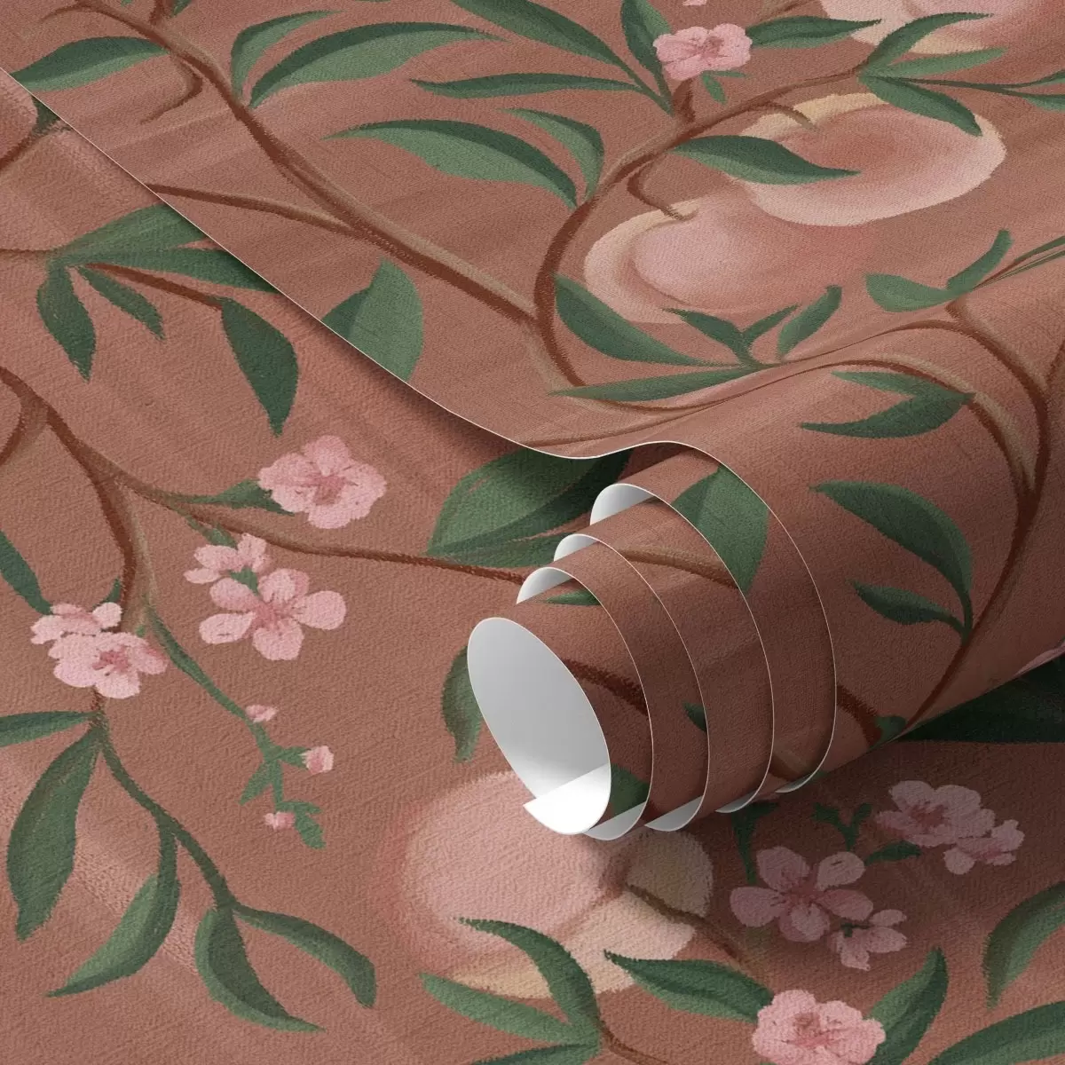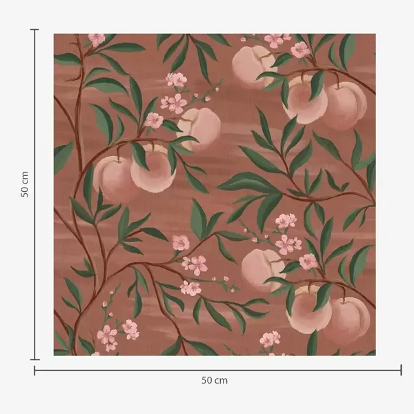 Papiers peints Pêches sur des branches aux fleurs roses, sol en terre cuite Nr. a00856