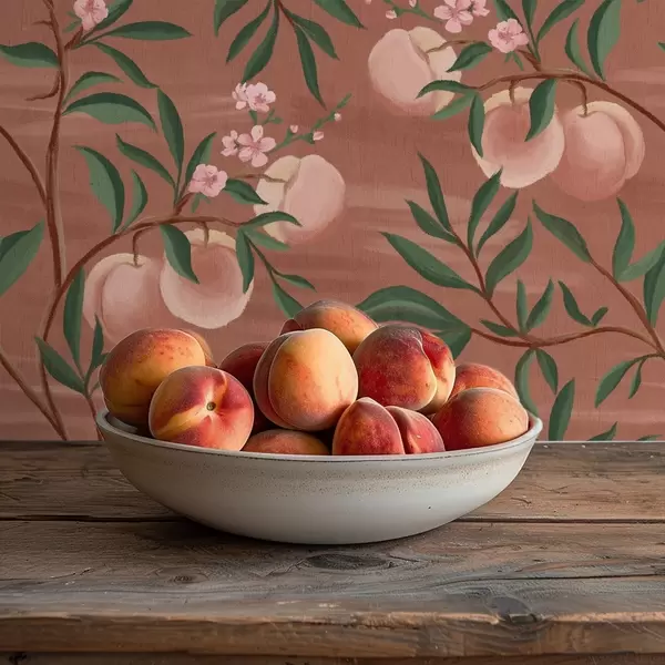 Papiers peints Pêches sur des branches aux fleurs roses, sol en terre cuite Nr. a00856