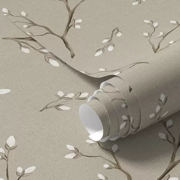 Papiers peints Brindilles avec bourgeons blancs sur fond lin taupe Nr. a00861
