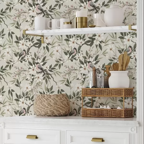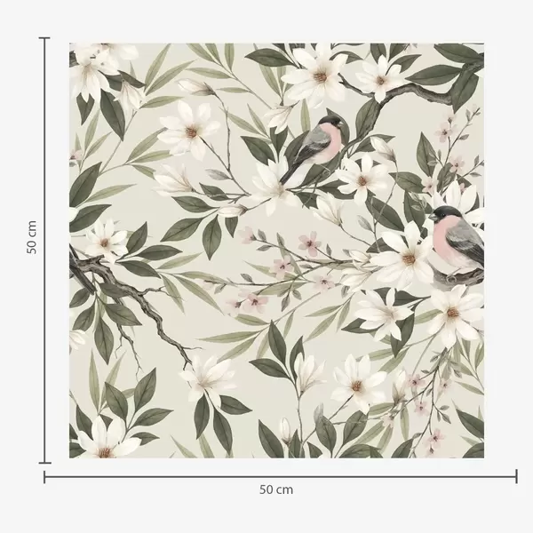 Papiers peints Bouvreuils à poitrine blanche sur des branches couvertes de fleurs crème Nr. a00889