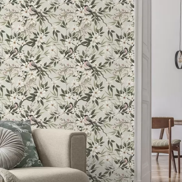 Papiers peints Bouvreuils à poitrine blanche sur des branches couvertes de fleurs crème Nr. a00889