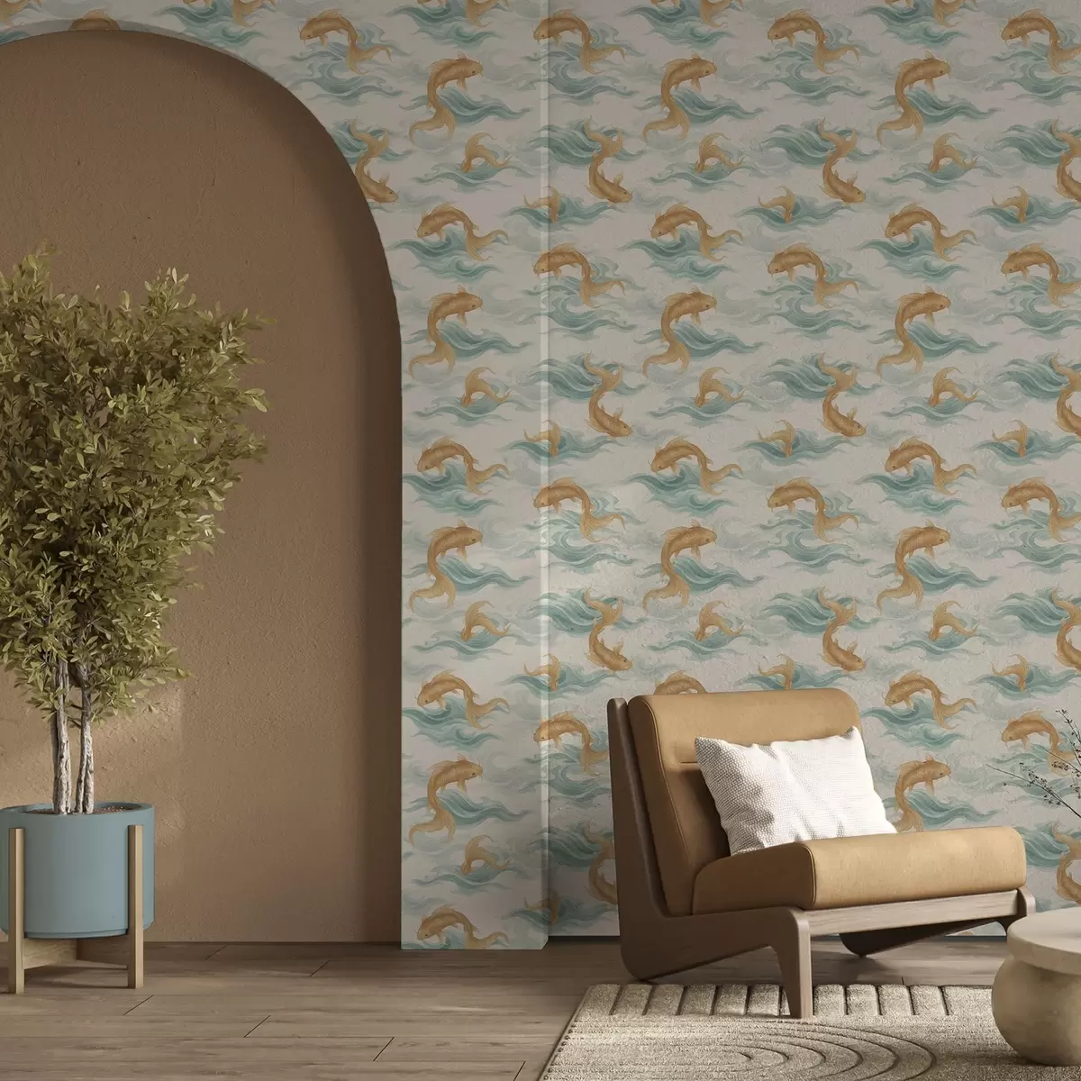 Papiers peints Poisson koi ambré nageant parmi les douces vagues turquoise Nr. a00894