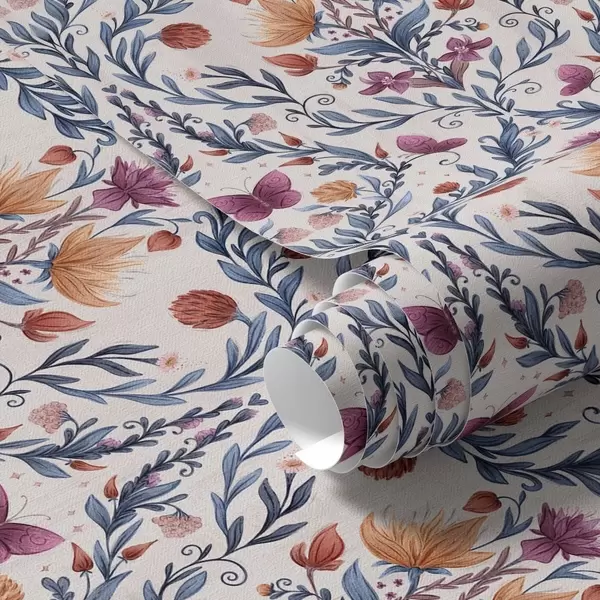Papiers peints Damassé floral avec papillons bleu marine et terracotta sur fond blanc Nr. a00926v1