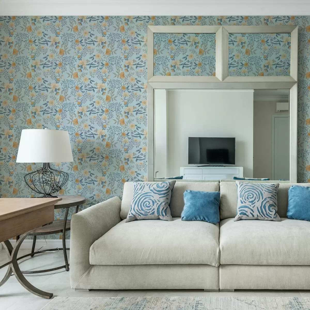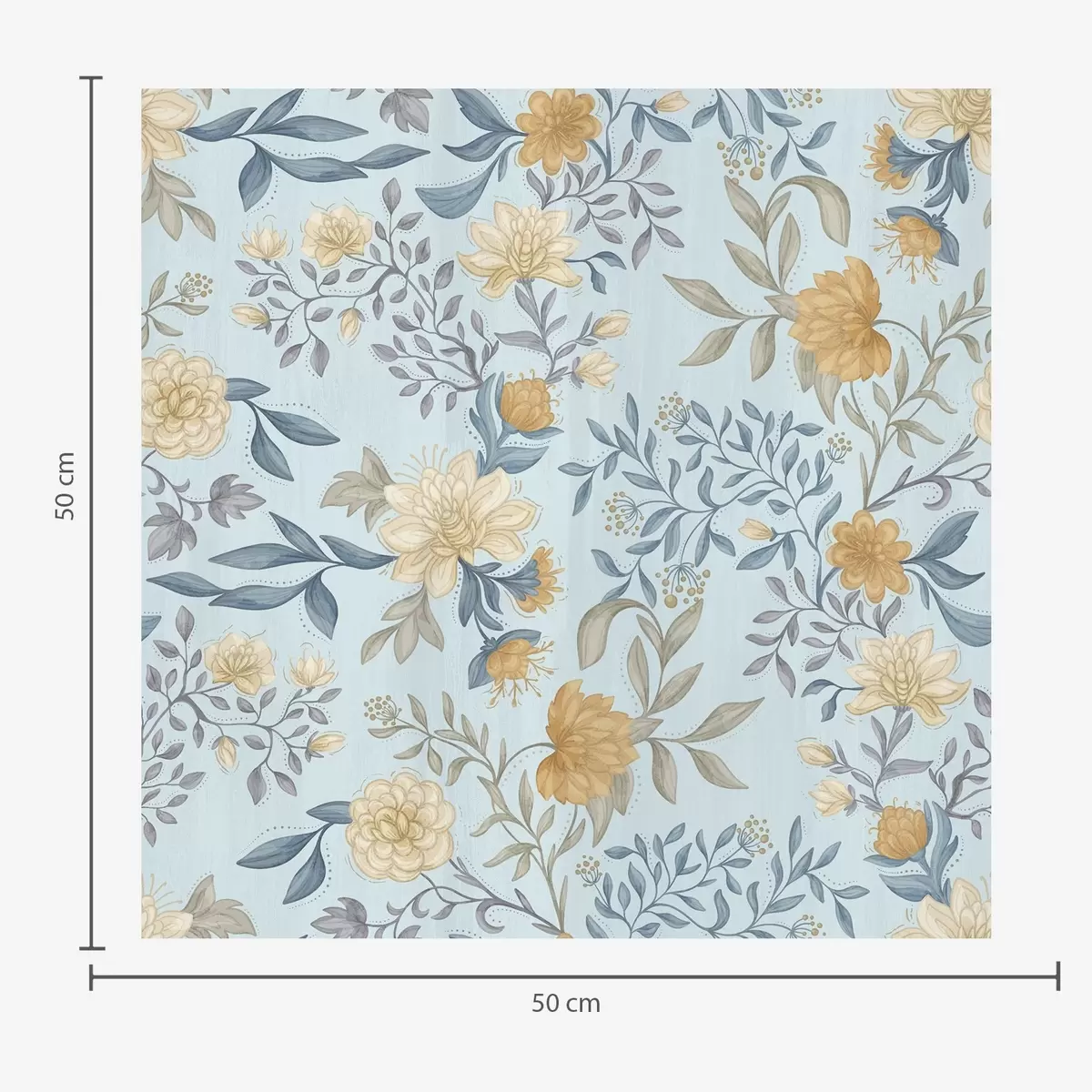 Papiers peints Fleurs jaunes et bleues avec des feuilles sur fond bleu ciel Nr. a00934