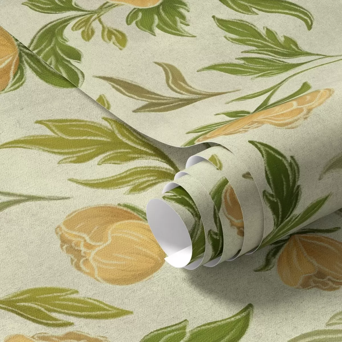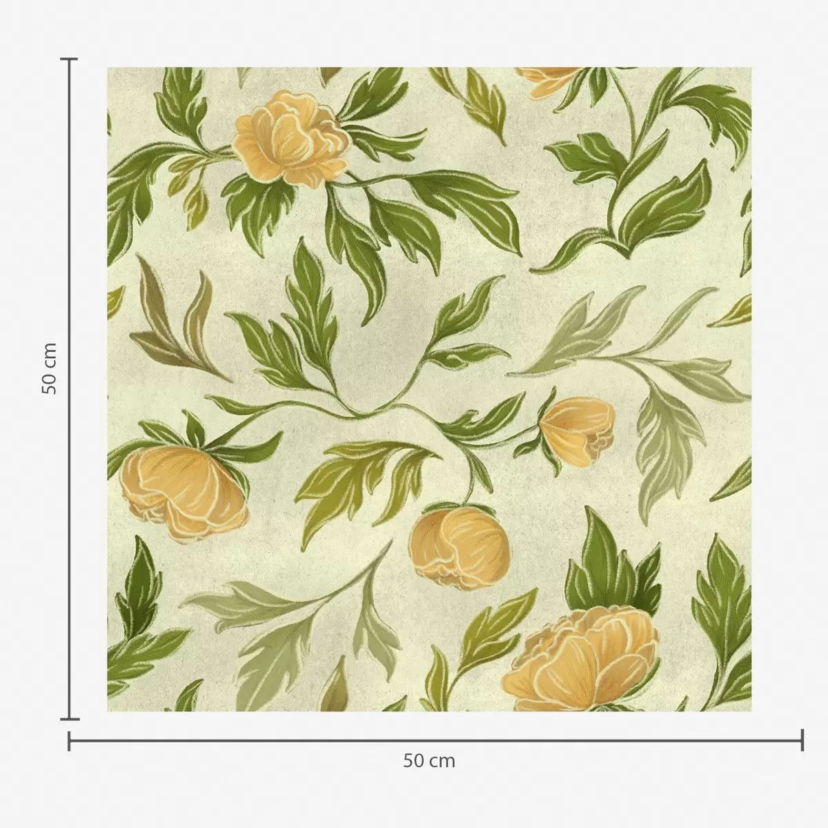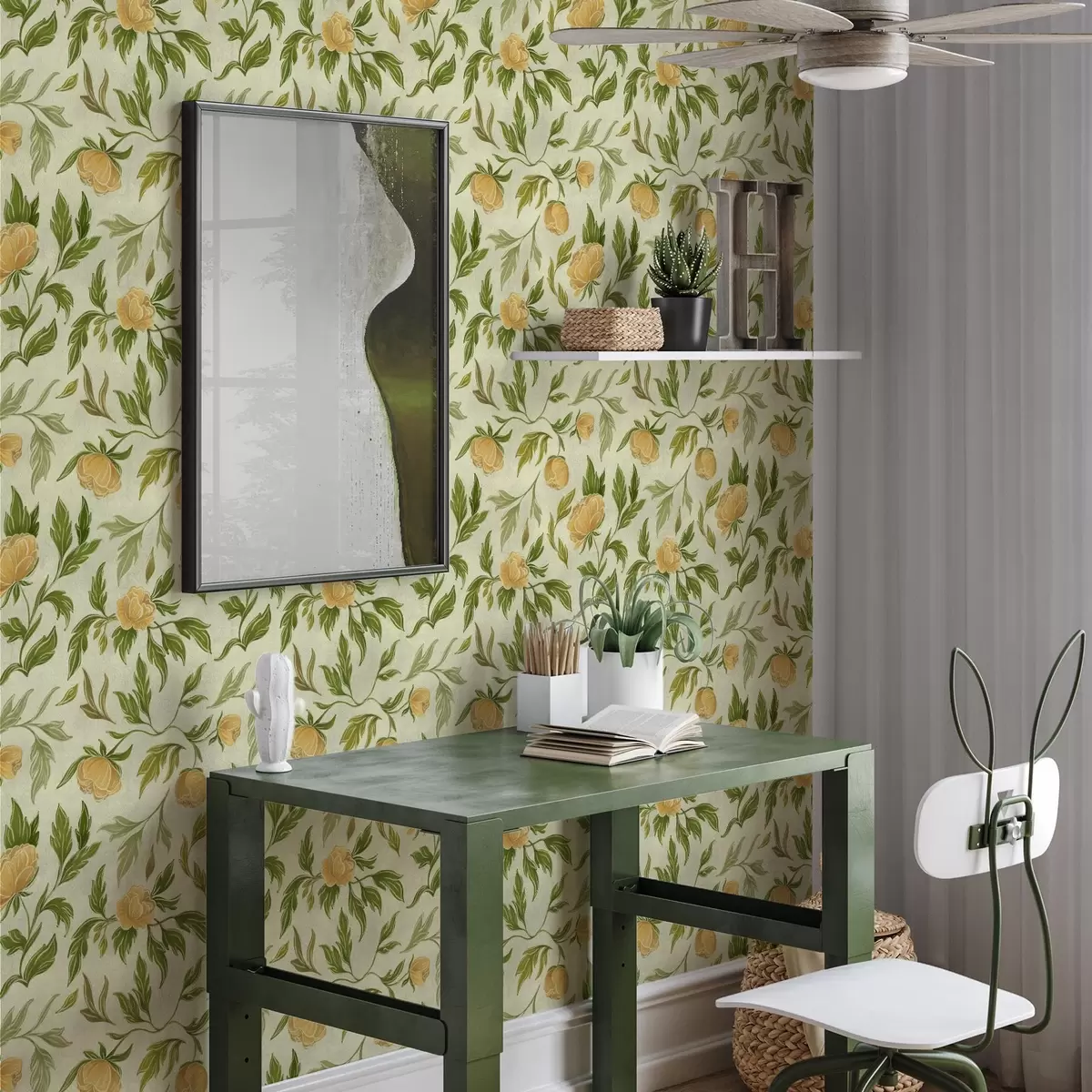 Papiers peints Pivoines jaunes et feuillage sur fond vert clair doux Nr. a00942