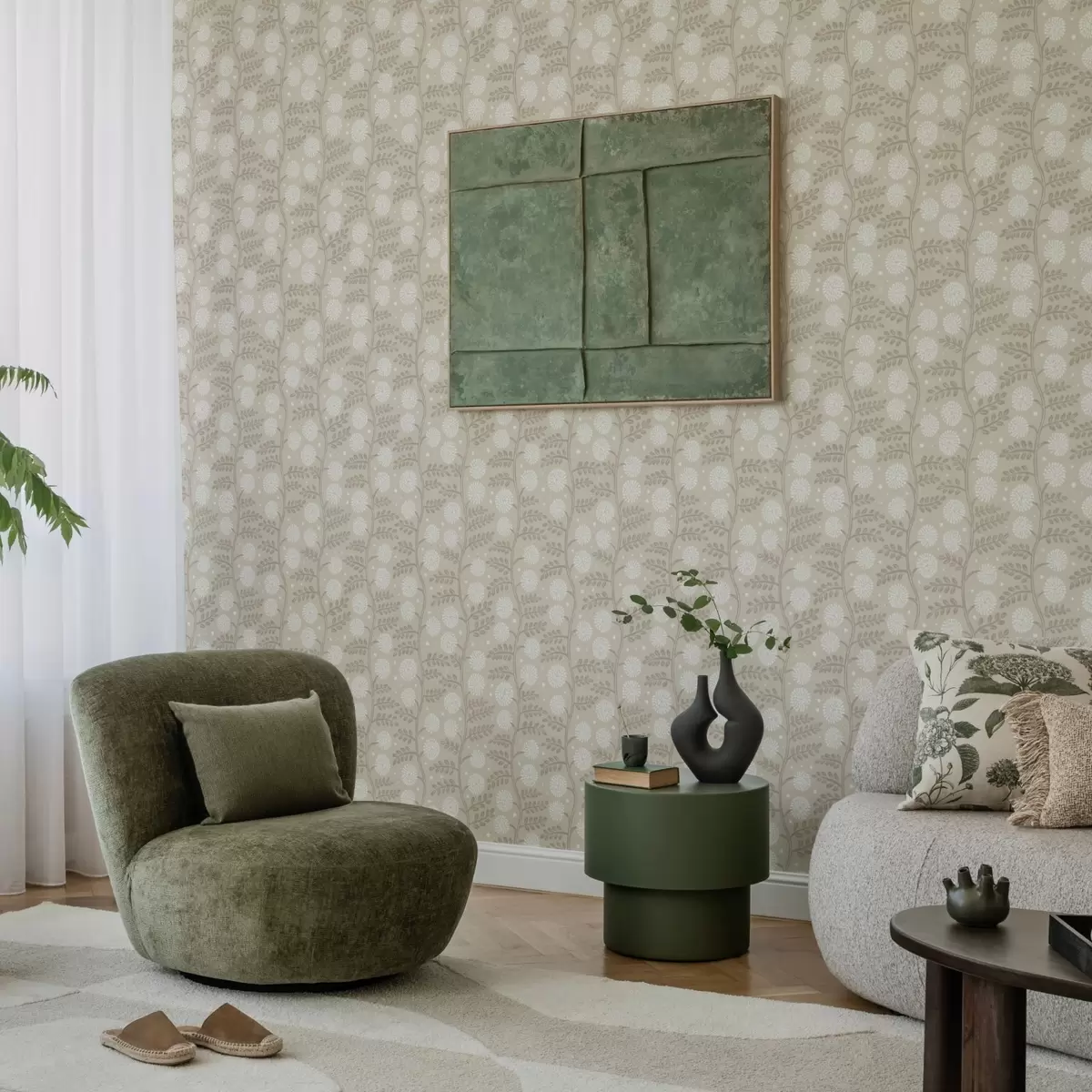 Papiers peints Tiges beiges avec des fleurs blanches duveteuses et des points doux Nr. a00997