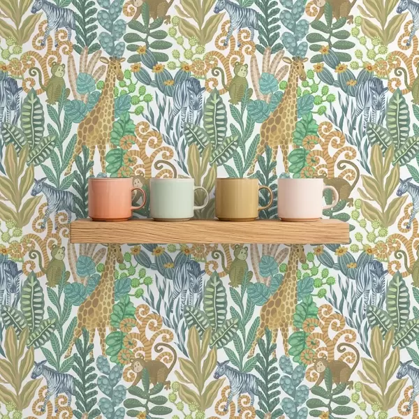 Papiers peints Animaux joyeux de la savane parmi les feuilles sur fond blanc Nr. a01000