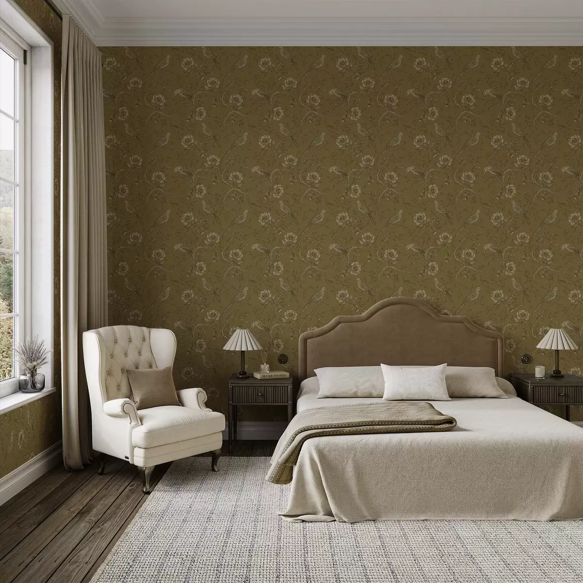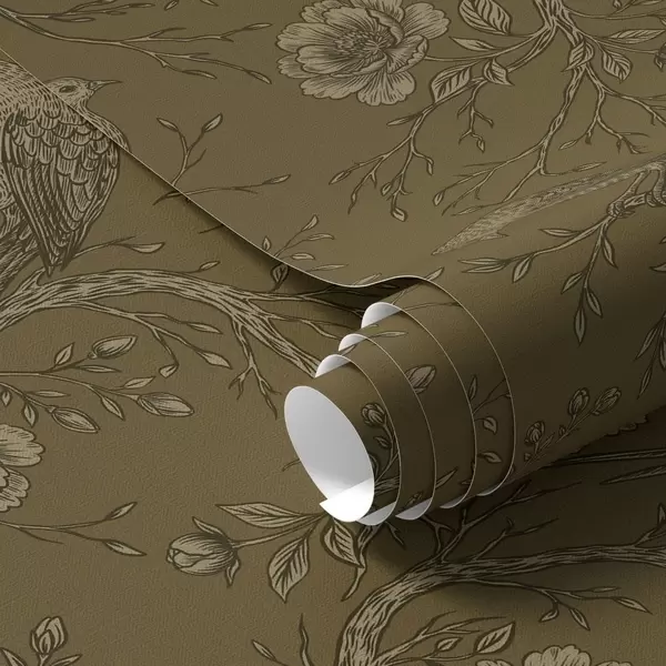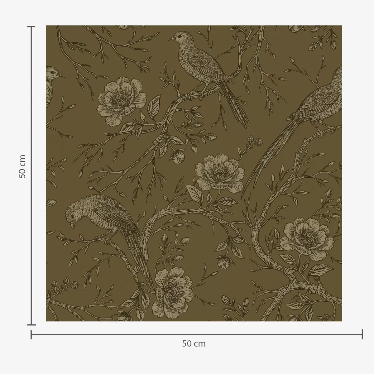 Papiers peints Oiseaux et fleurs vintage sur un fond olive chaleureux Nr. a01022v1