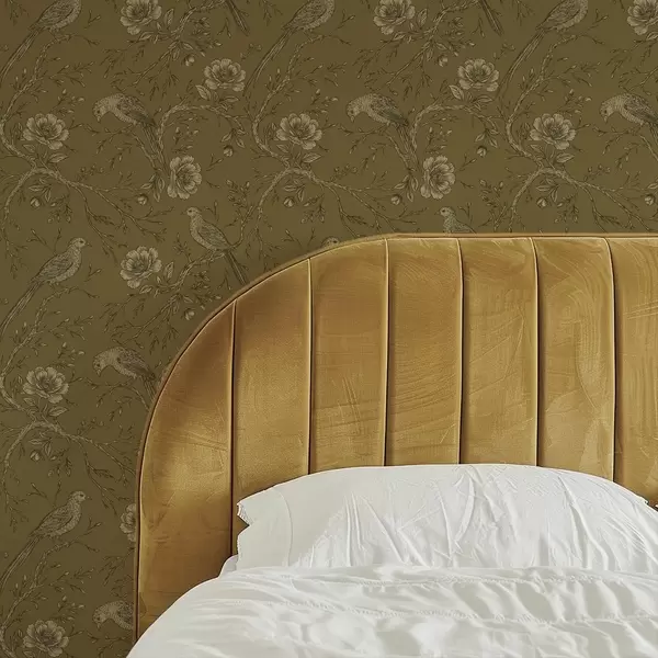 Papiers peints Oiseaux et fleurs vintage sur un fond olive chaleureux Nr. a01022v1