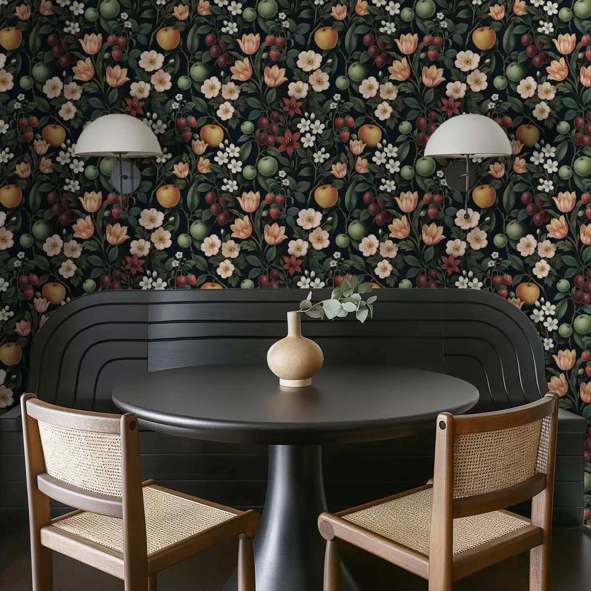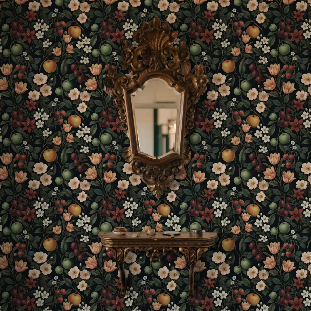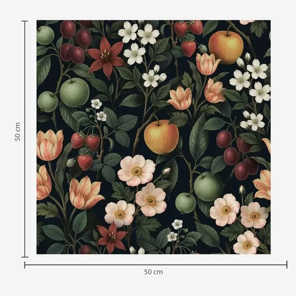 Papiers peints Jardin sombre avec des fleurs, des pommes mûres et des baies Nr. a01034