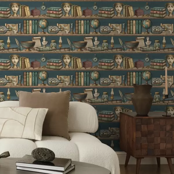 Papiers peints Étagères vintage avec des livres, un globe terrestre et des curiosités marines Nr. a01036
