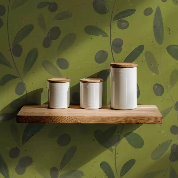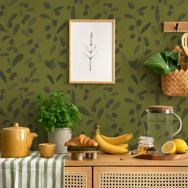Papier peint Branches vertes avec feuilles et baies sur olivier a01113