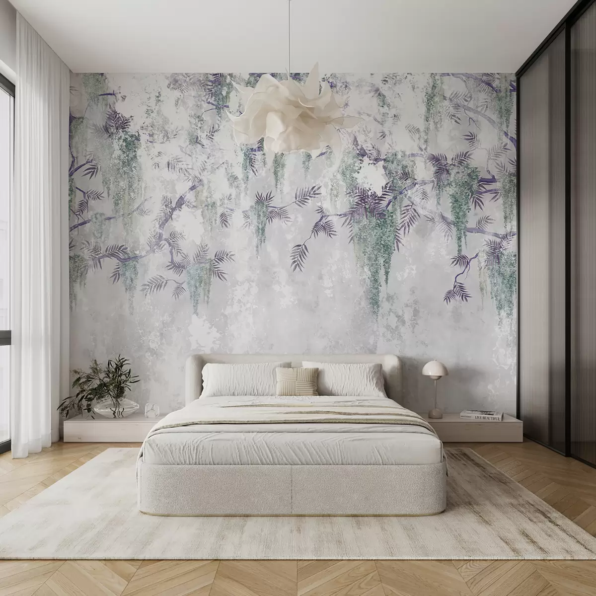 Papier peint Branches grunge suspendues avec des fleurs violettes dans des couleurs bleues N° u73816v1