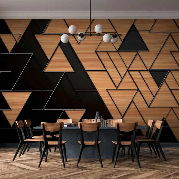 Papier peint triangles 3D gris foncé et grain de bois avec lignes en relief N° u75167