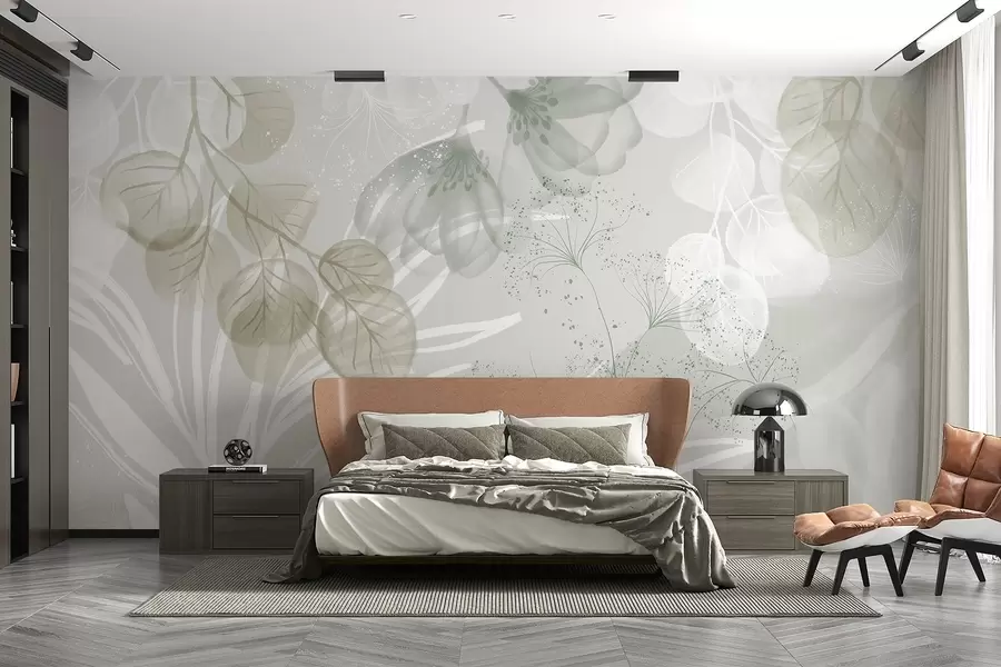 Papiers peints Éléments floraux d'eucaliptus dans les tons de vert et de blanc avec des feuilles et des pétales qui se chevauchent dans un style minimaliste
