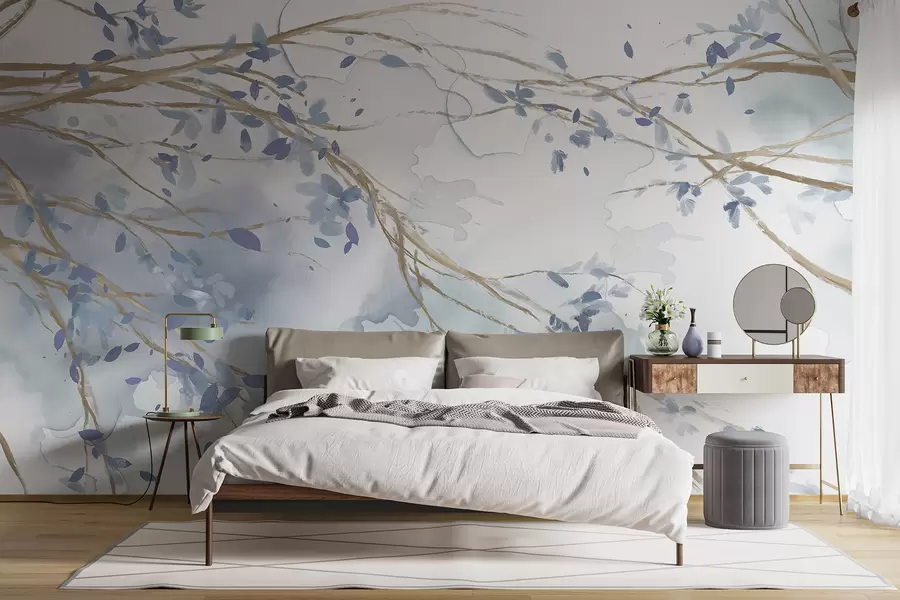 Papiers peints Branches avec feuilles dans les tons bleus et bruns, fond clair, doux et délicat, style aquarelle