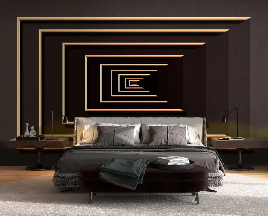 Papiers peints des feuilles abstraites dans une palette de tons terreux - beige, terracotta et gris foncé.