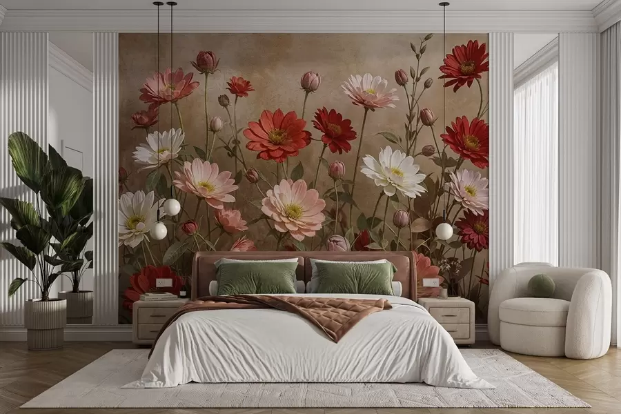 Papiers peints Un champ de fleurs colorées ressemblant à des marguerites dans différentes nuances de rose, de rouge et de blanc sur un fond texturé