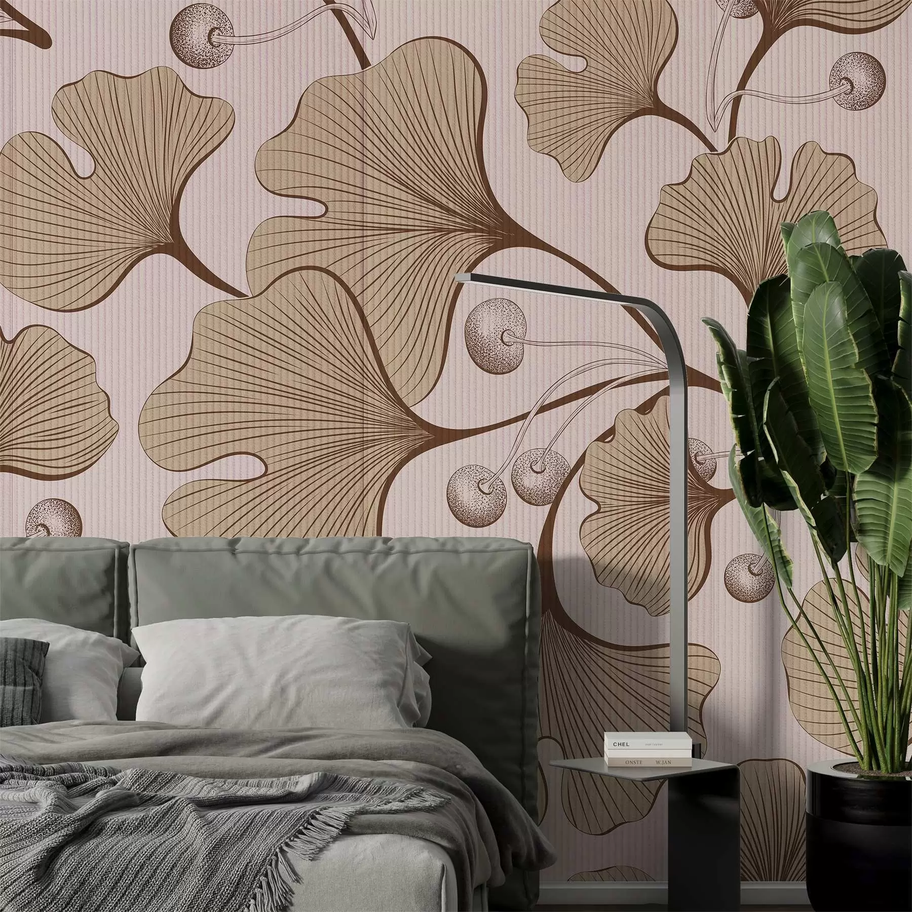 Papiers peints Herbe et mauvaises herbes avec des feuilles et des tiges fines, couleurs roses claires, coups de pinceau doux et délicats, impression minimaliste