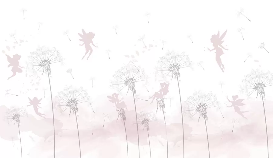 Papiers peints Fées magiques dans les pissenlits et les fleurs sauvages de style scandinave pour les filles de couleur rose