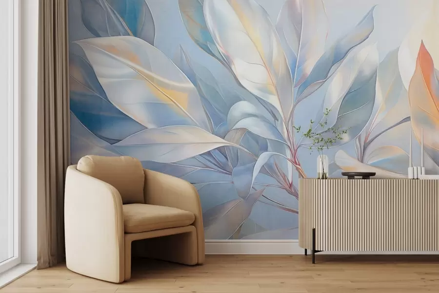 Papiers peints Feuilles de magnolia aux tons blancs et bleus, éclairage doux, composition élégante, détails des nervures des feuilles, coups de pinceau artistiques