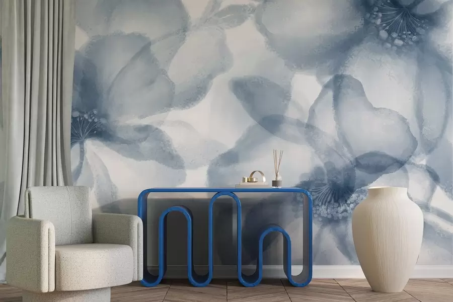 Papiers peints Fleurs bleues abstraites, douces et floues, créant un imprimé floral serein et apaisant