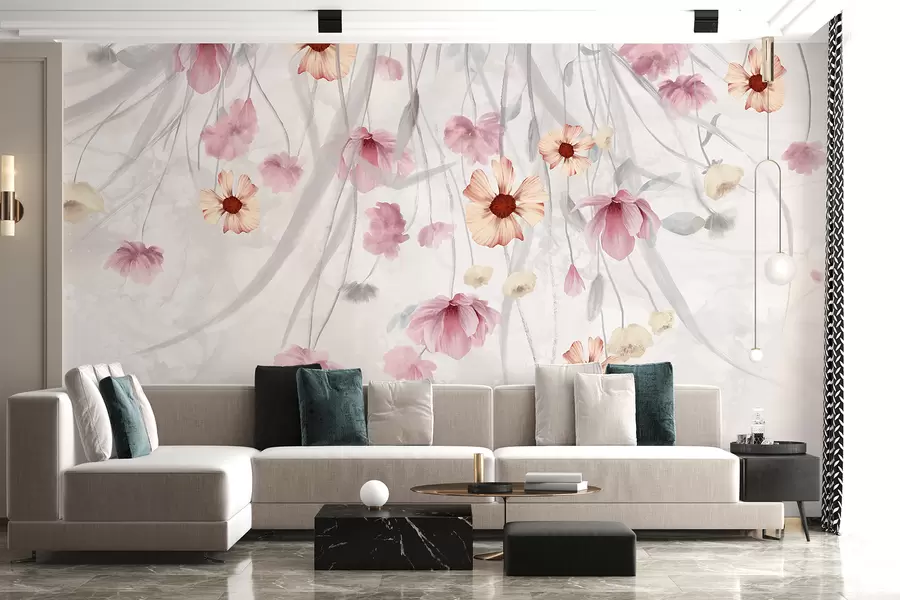 Papiers peints Délicates fleurs roses et jaunes pastel avec centre jaune tombant en cascade sur un fond doux et flou