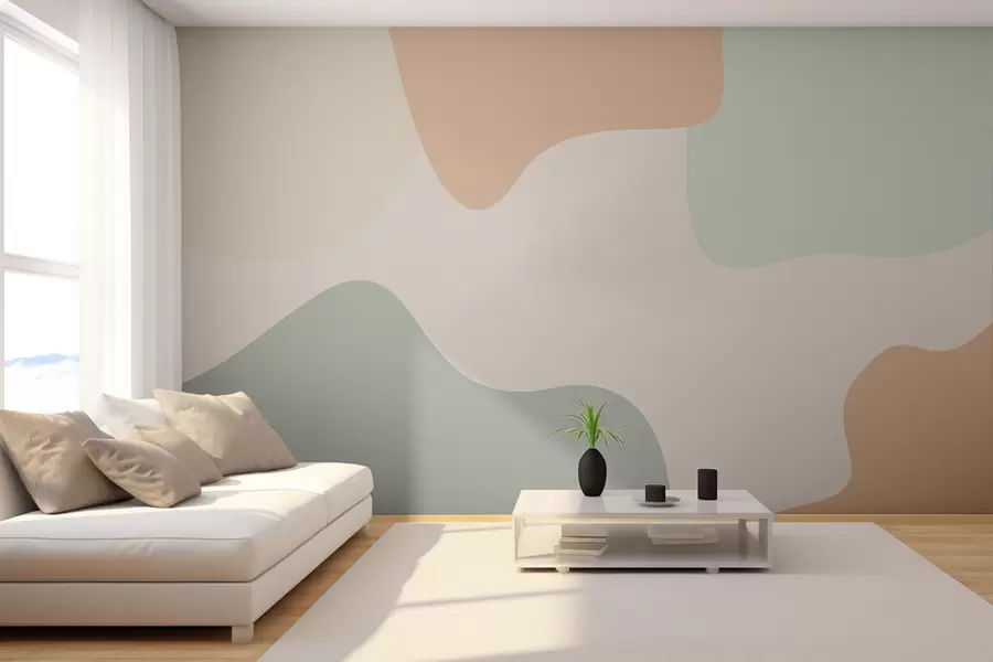 Papiers peints Motif abstrait de formes organiques douces dans les tons gris-vert et beige, accentué par de délicates lignes blanches