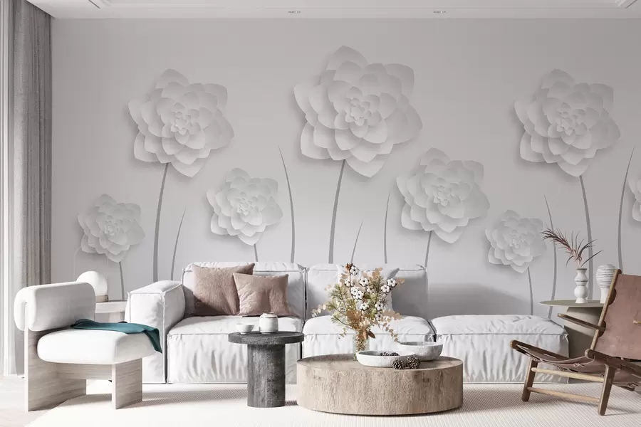 Papiers peints Grandes fleurs avec imitation de volume en style papier sur fond gris clair avec une tige grise