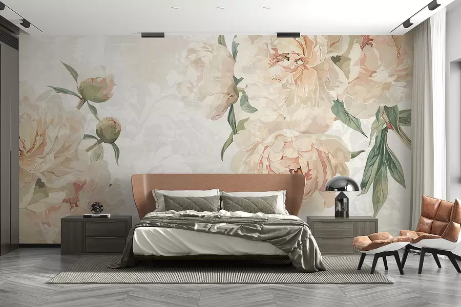 Papiers peints Grandes pivoines délicates de couleur pêche avec des feuilles vertes sur un fond doux et légèrement texturé