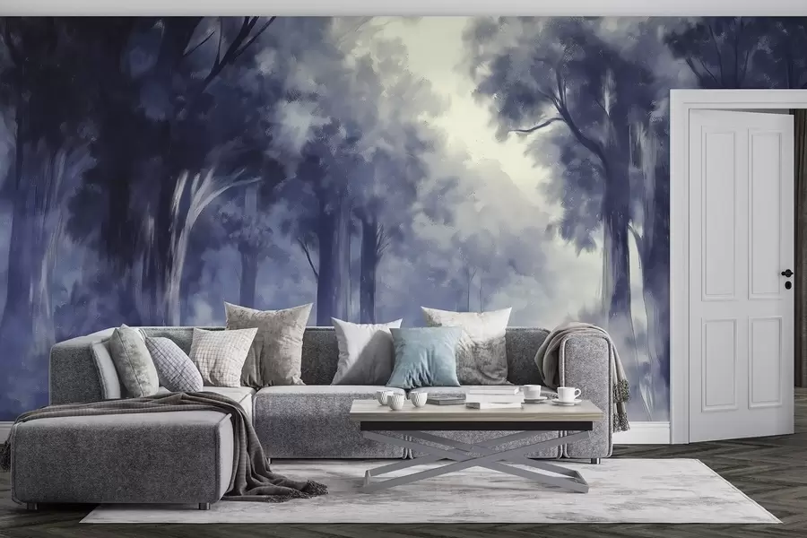 Papiers peints Forêt mystique, pins, brouillard, peinture acrylique, couleurs bleues profondes