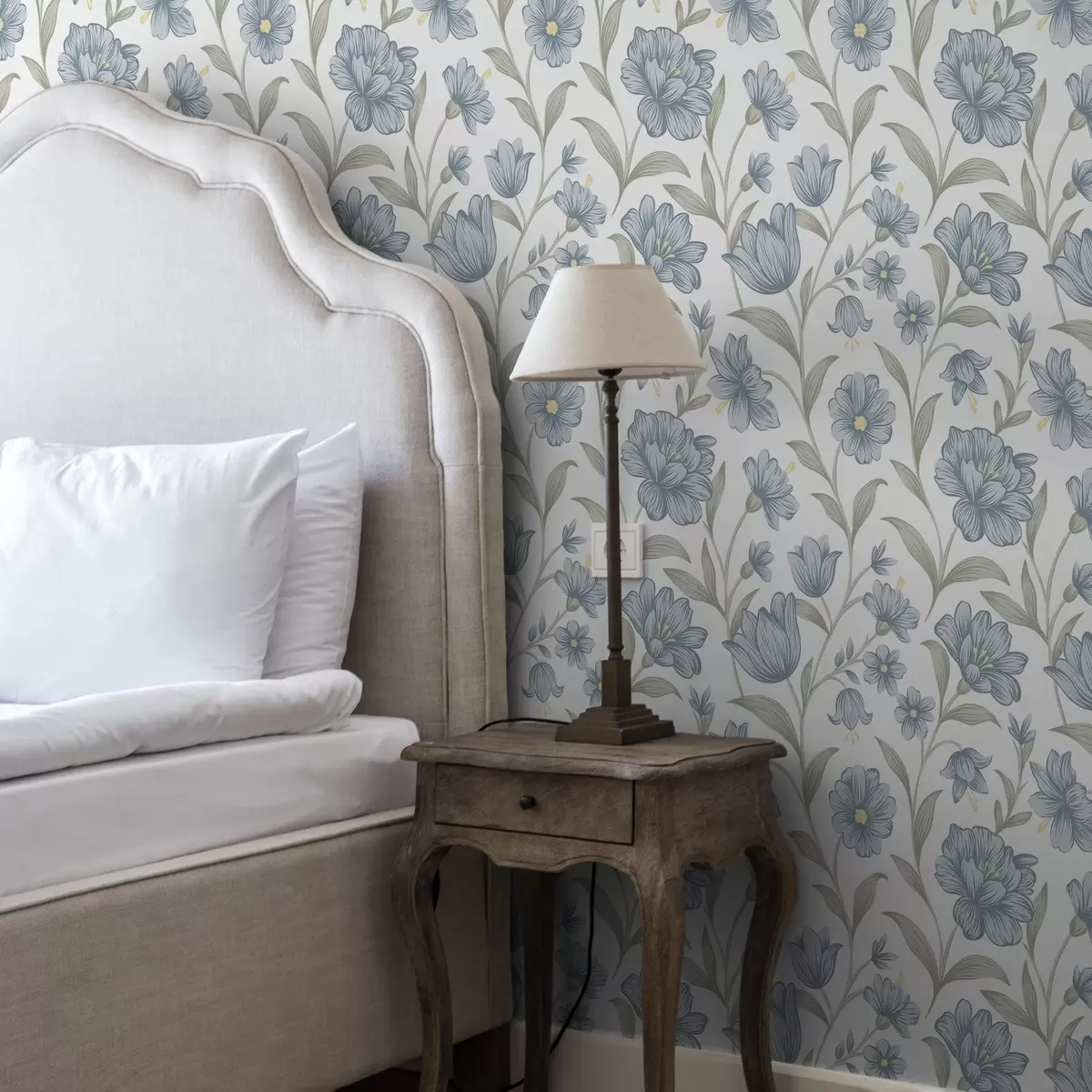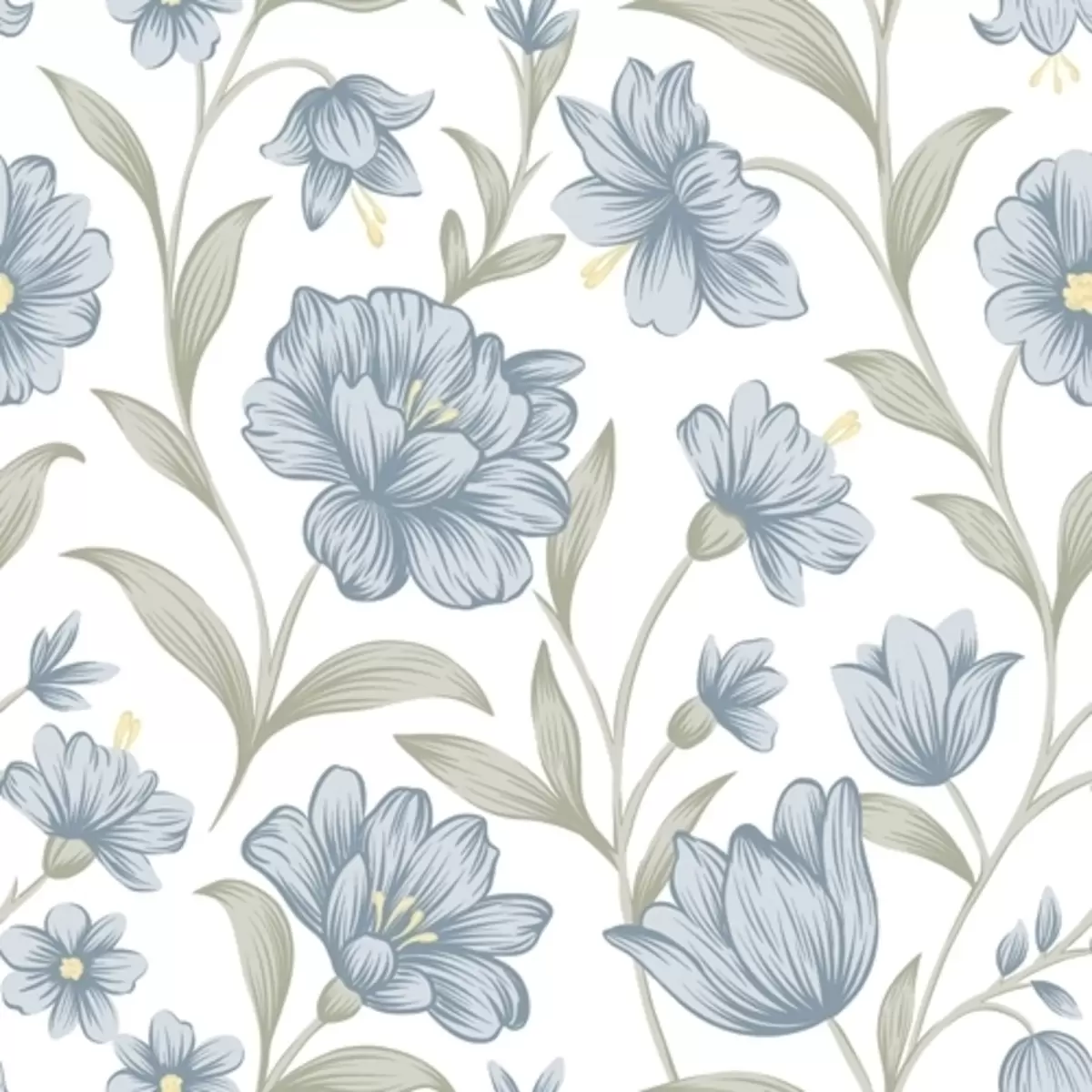 Papier peint Fleurs bleu poussiéreux avec feuilles d'olivier sur fond blanc N° a00780