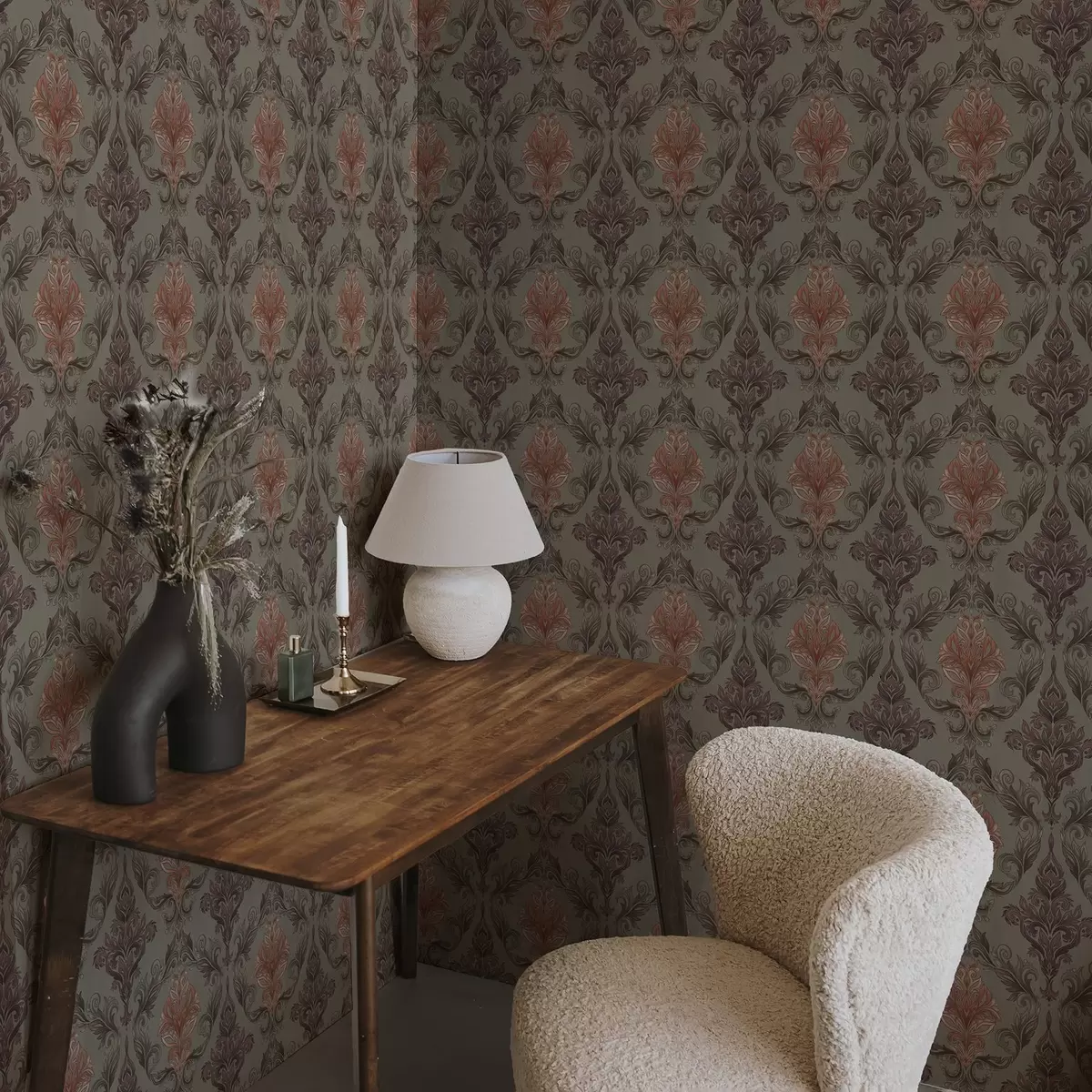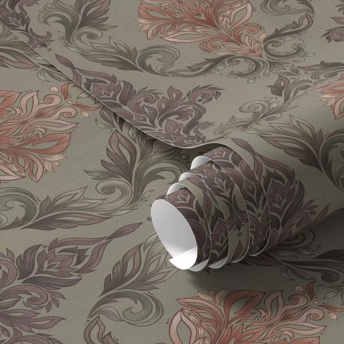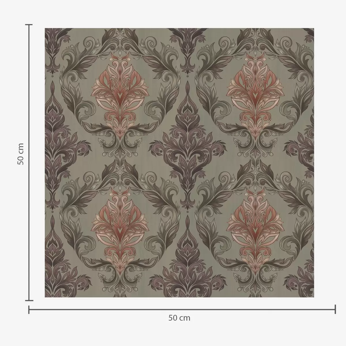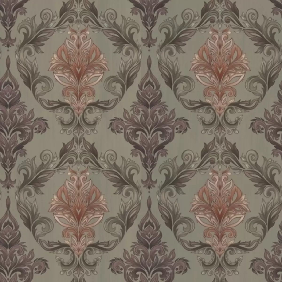 Papier peint Damassé terracotta sur fond olive discret N° a00828v3