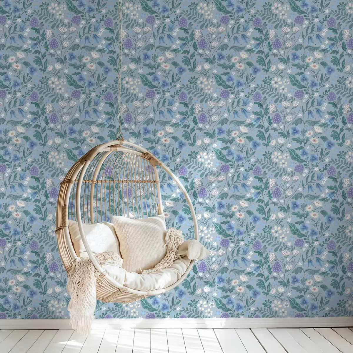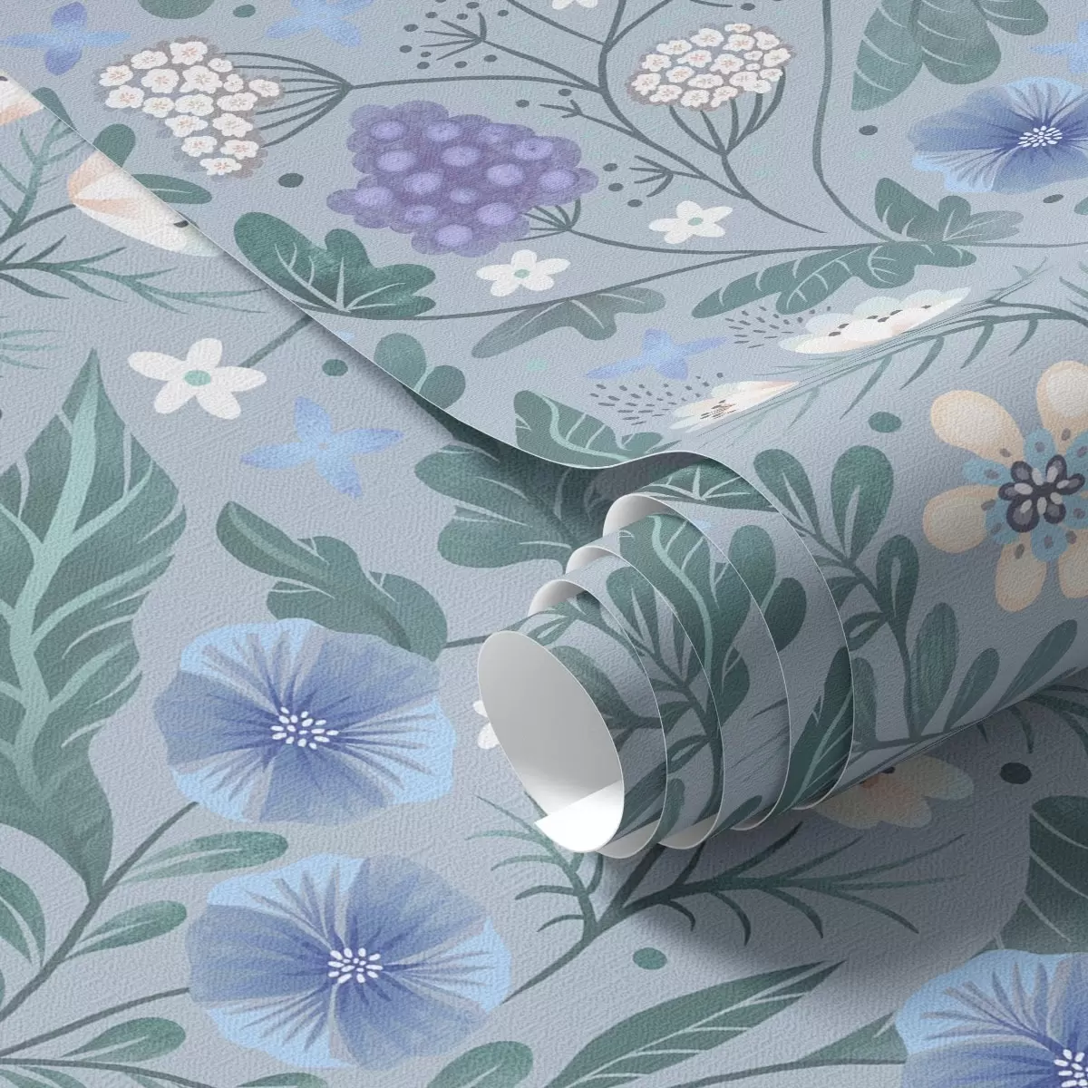 Papier peint Fleurs sauvages et baies sur fond gris-bleu a00849v1