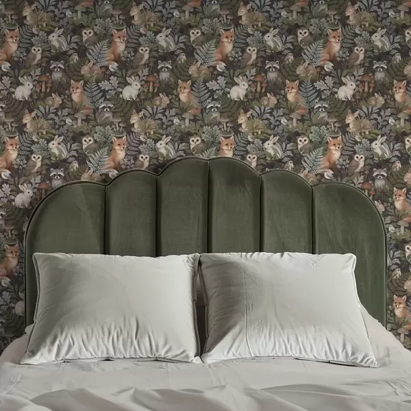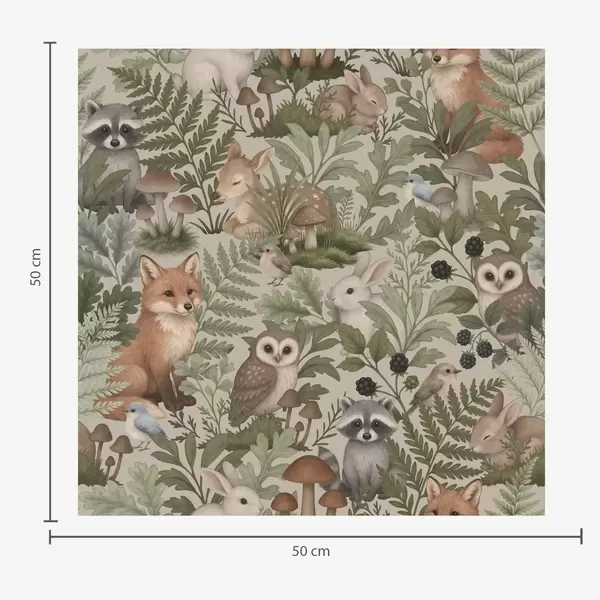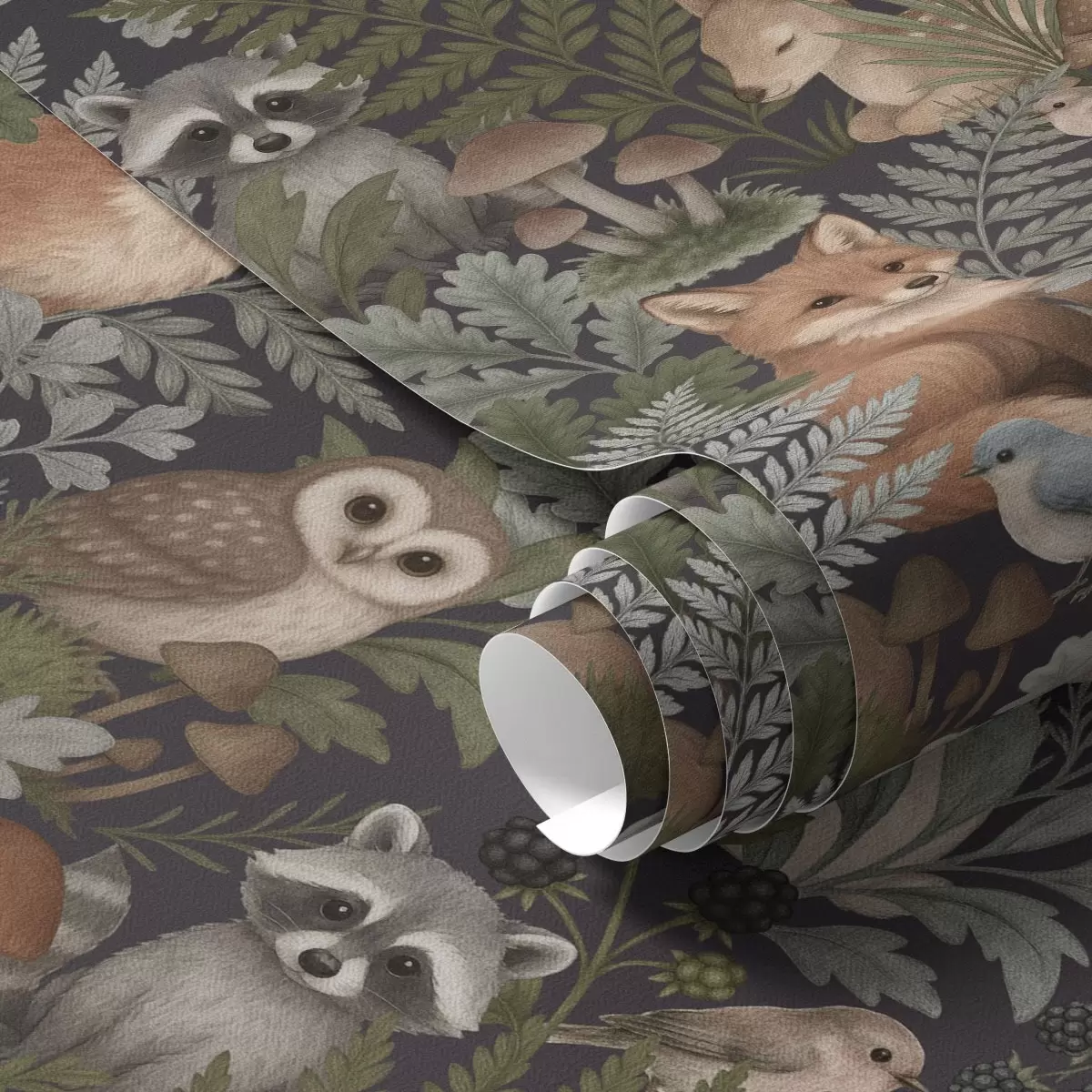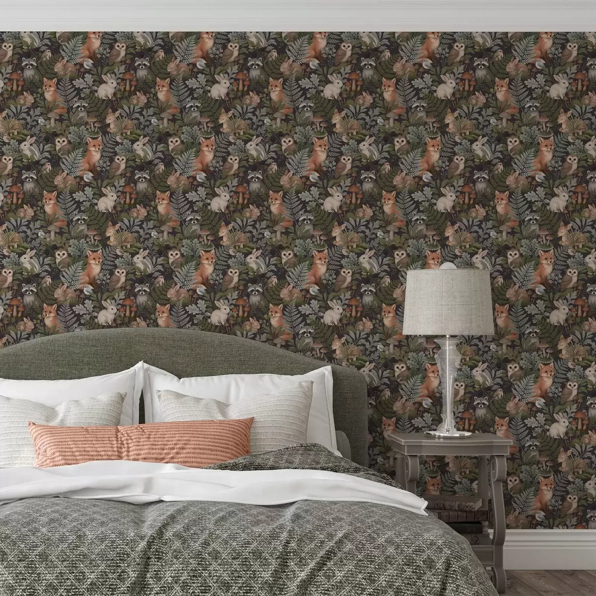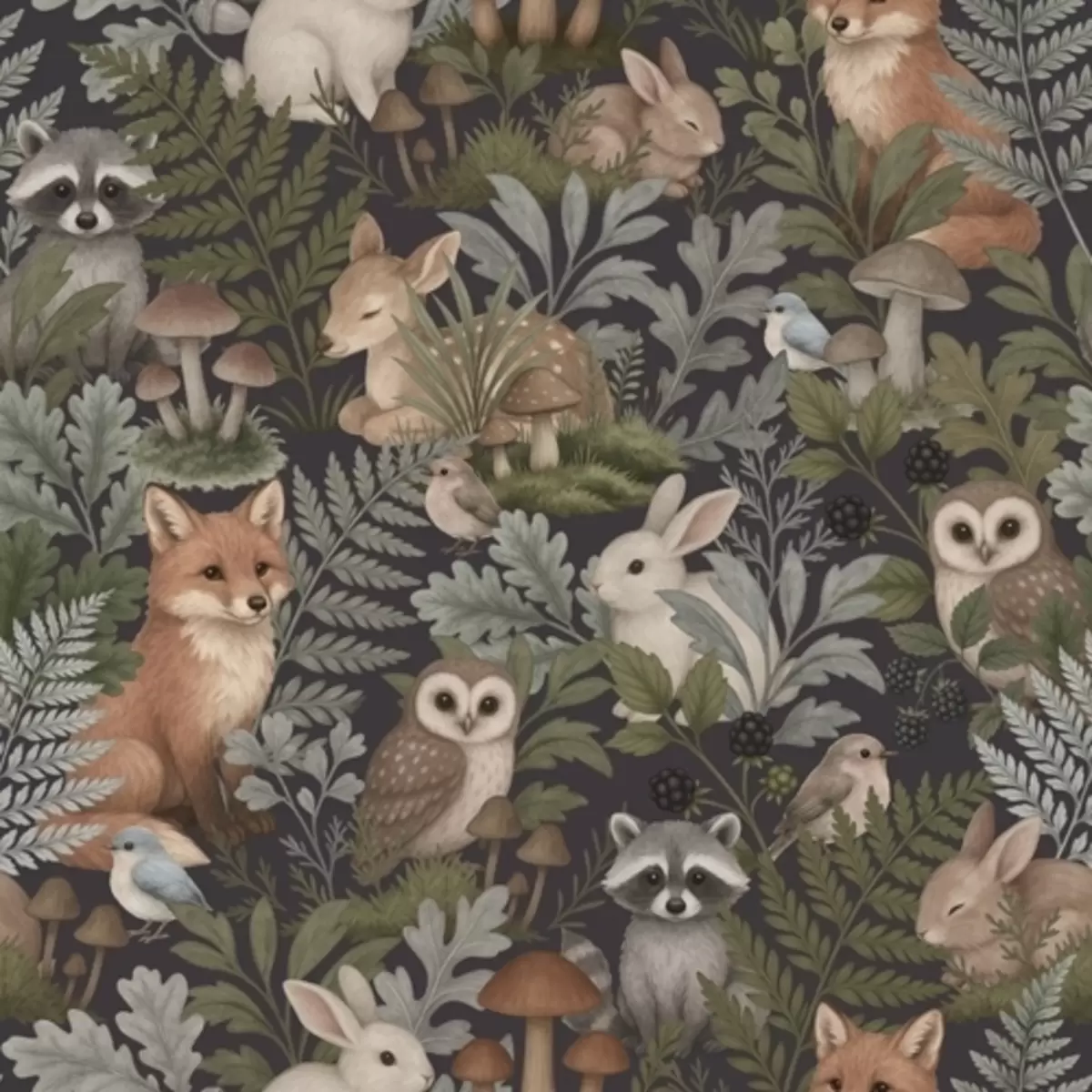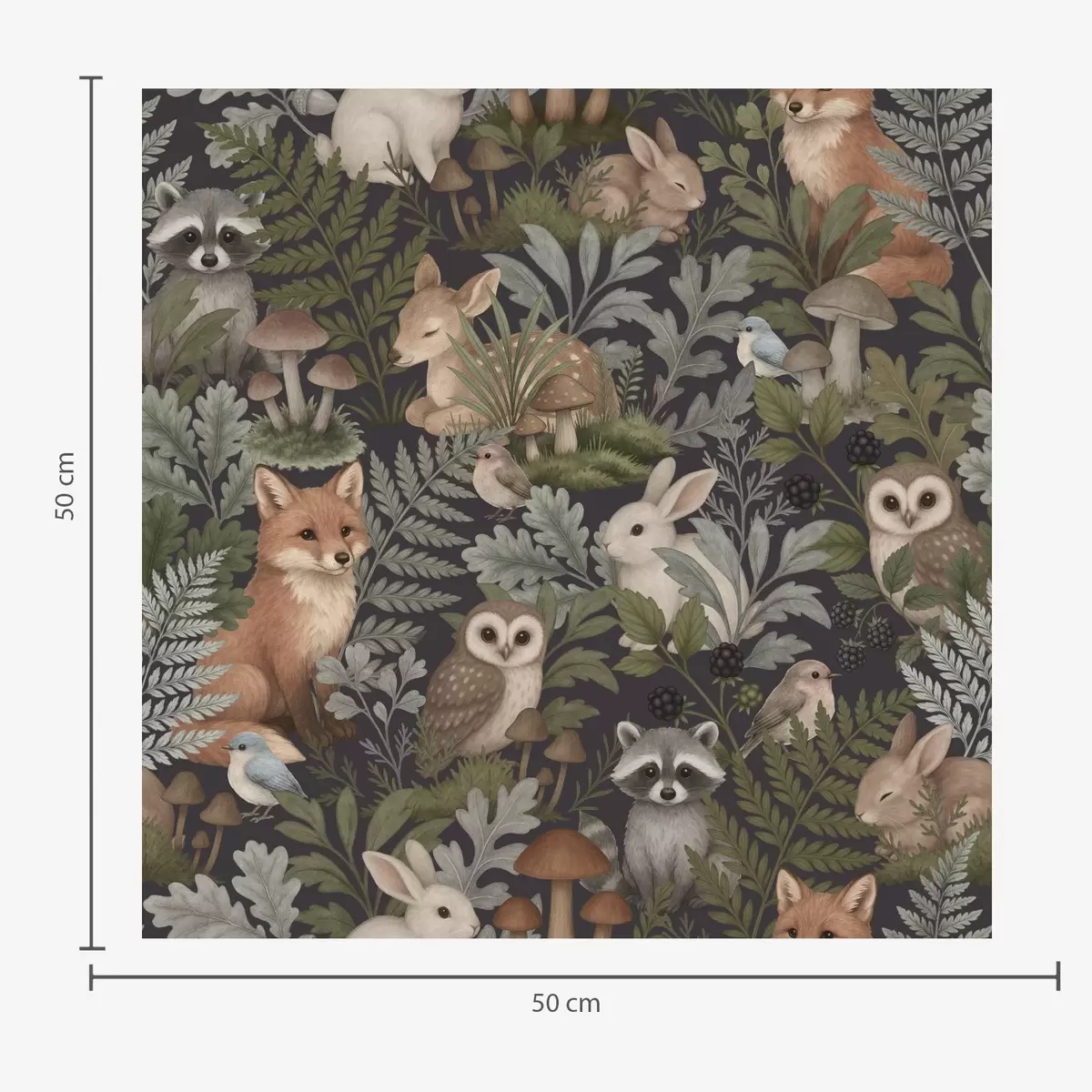 Papier peint Animaux des bois et fougères sur fond charbon foncé N° a00880