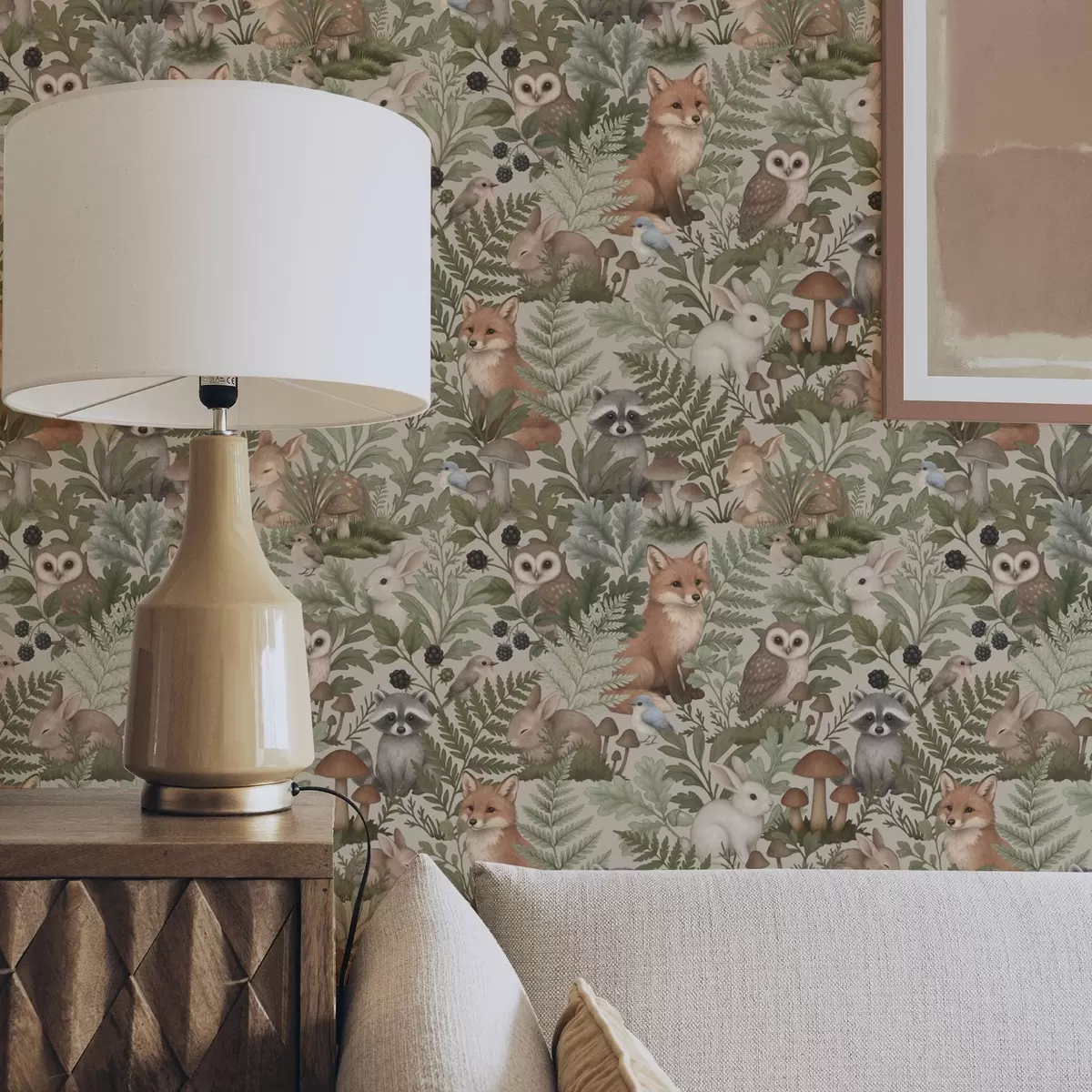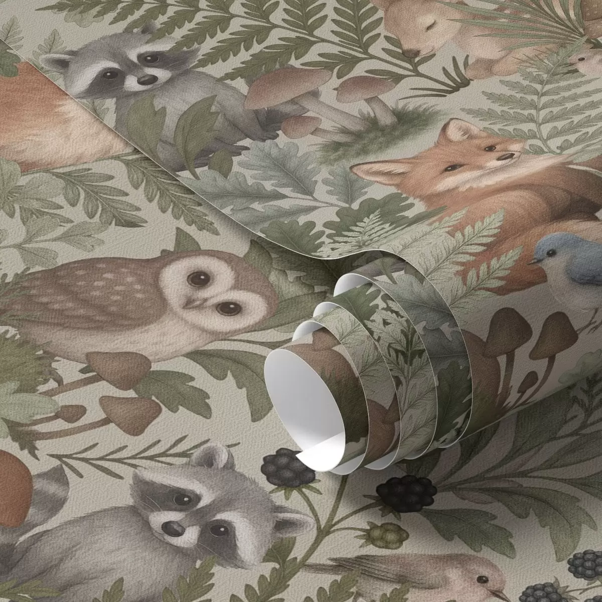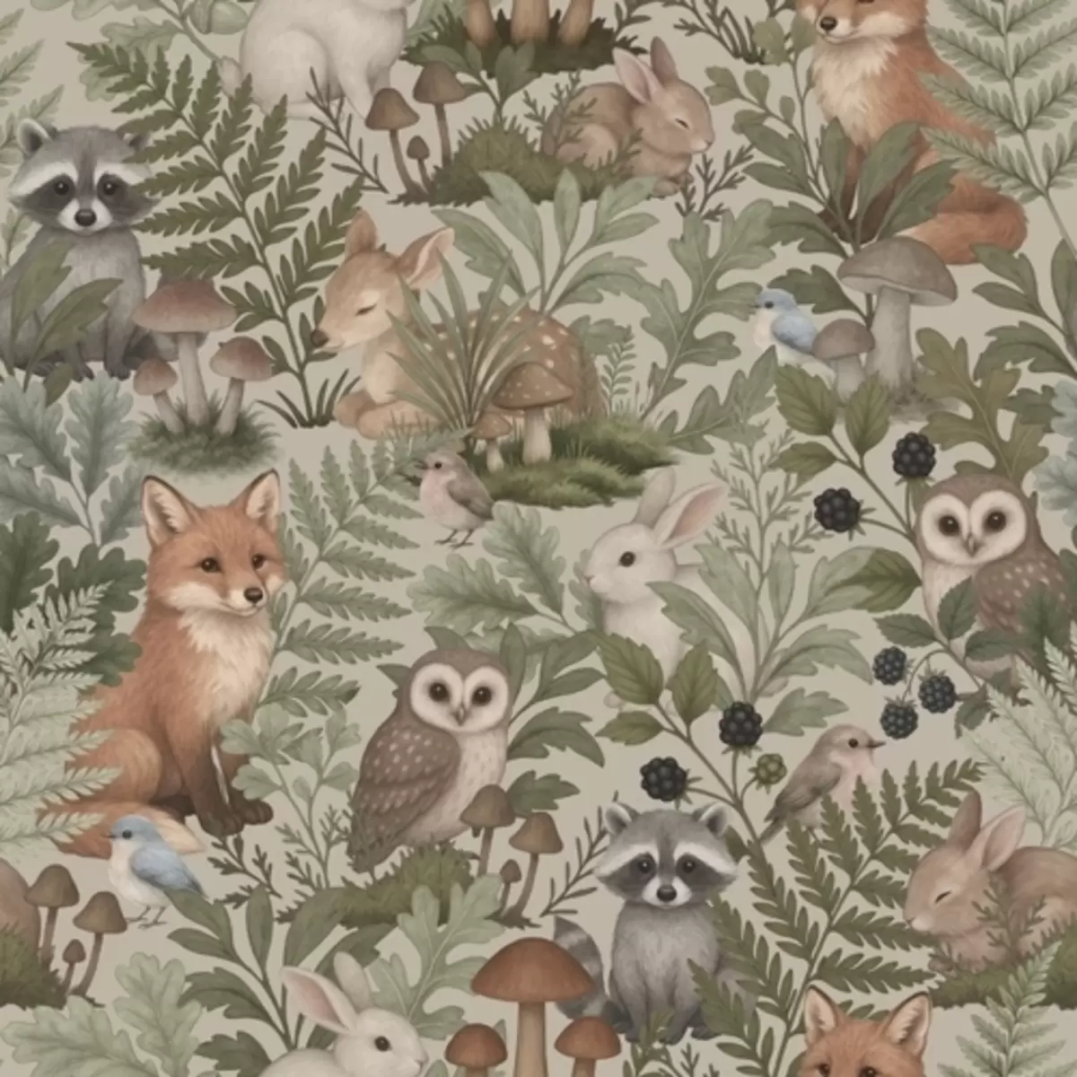 Papier peint Animaux des bois, fougères et champignons sur fond beige clair N° a00880v1
