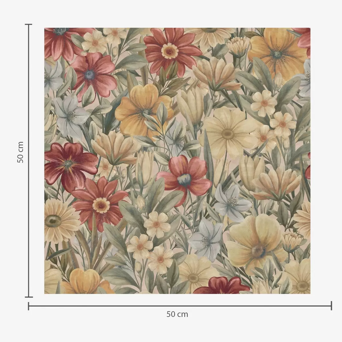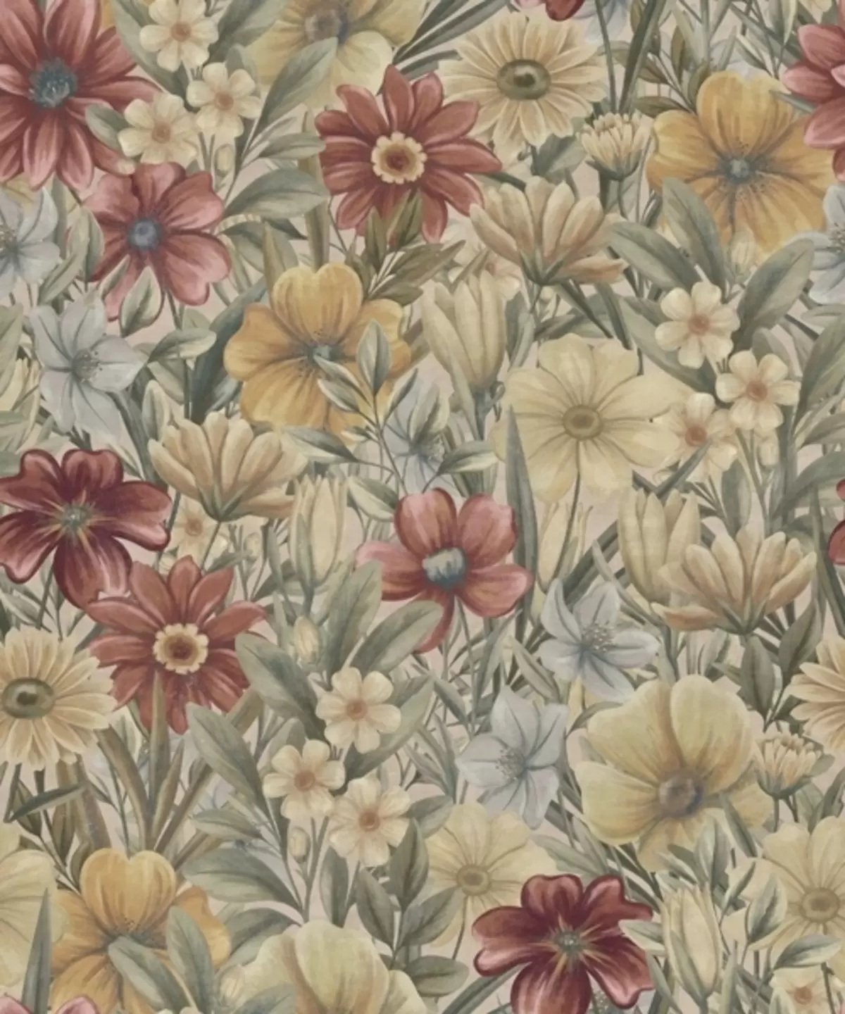 Papier peint Fleurs des champs vintage dans des tons chauds de jaune, rouge et sauge N° a00906
