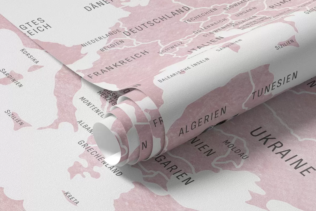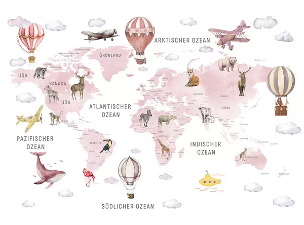 Papier peint Carte pour enfants au style aquarelle avec des animaux et des montgolfières. En allemand. Couleur rose. N° c00001dev3