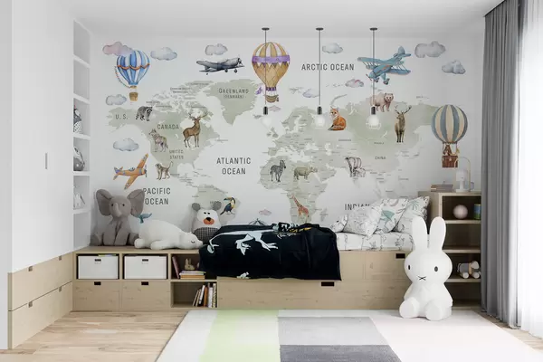 Papier peint Carte pour enfants au style aquarelle avec des animaux et des montgolfières. En anglais. Couleur verte. N° c00001en