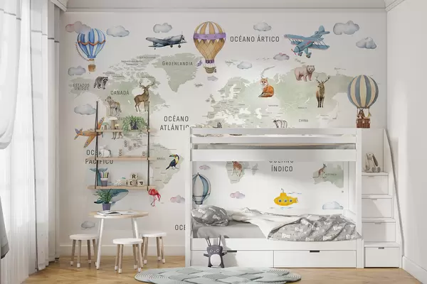 Papier peint Carte pour enfants au style aquarelle avec des animaux et des montgolfières. En espagnol. Couleur verte. N° c00001es
